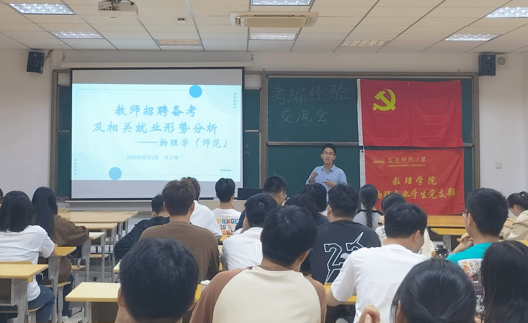 “考编并非易事,虽道阻且长,然行则将至。”成功考取教师编制,物理学专业2020级的项文锋、朱欣然、何建华、李喆等四位学生,对教师编制考试的时间、内容和流程进行了梳理,从招考形势、信息获取、如何备考等方面与学生探讨分享,详细介绍了有关教师编制考试方面的内容。“要合理利用好零碎的学习时间,提高备考效率,找出自己的薄弱模块做有针对性的提升。”李喆希望备考学生能够把握机会,保持对学习的热情,在失败中积累经验,不断提升自身能力。
