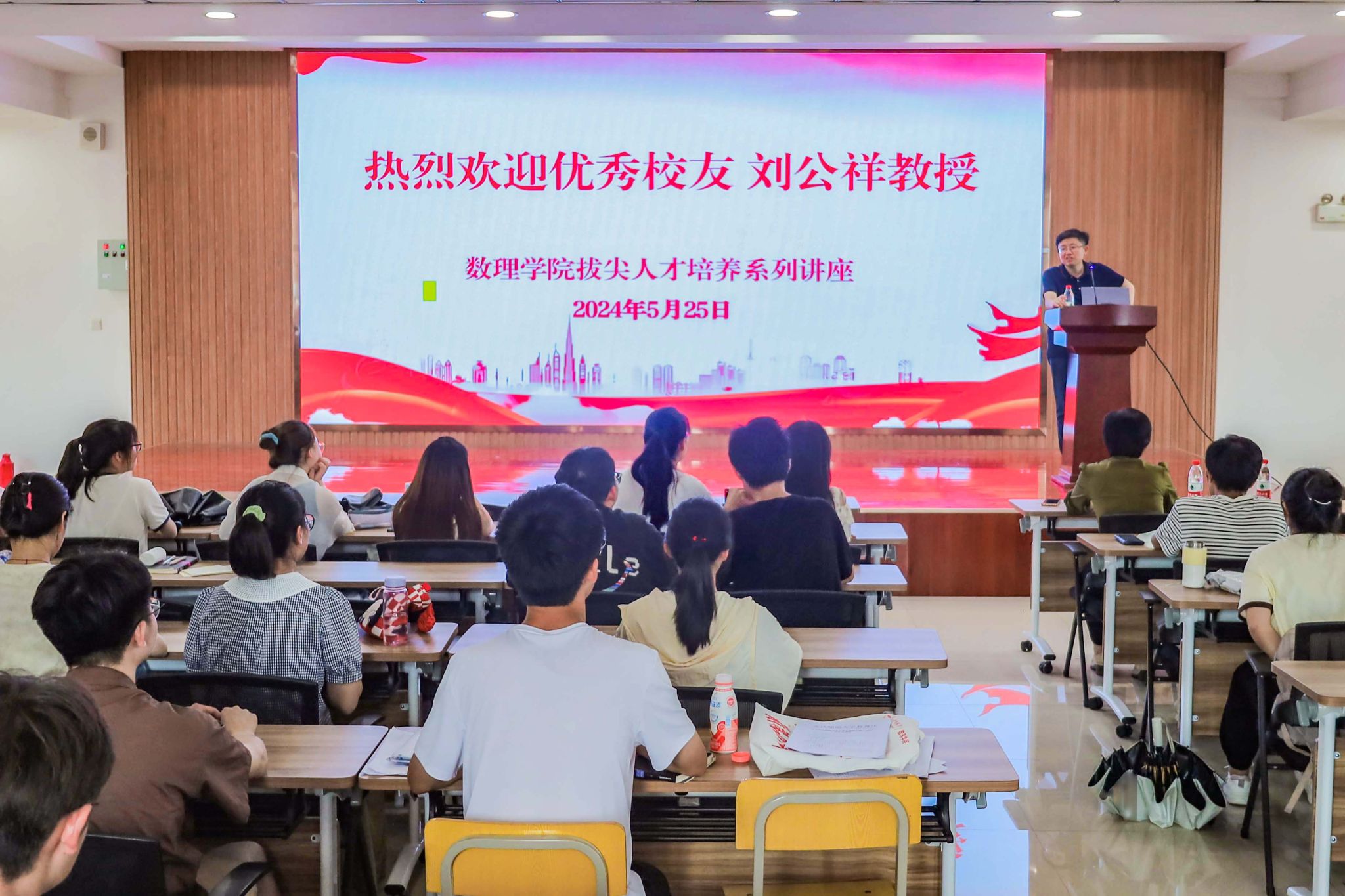 5月25日,数理学院在401报告厅举办拔尖人才培养讲座。数理学院特邀请校友、南京大学数学系教授、博士生导师刘公祥作报告。数理学院部分教师、4个稼先班学生和稼先班辅导员老师100余人参会,会议由学院党委副书记彭芳珍主持。
