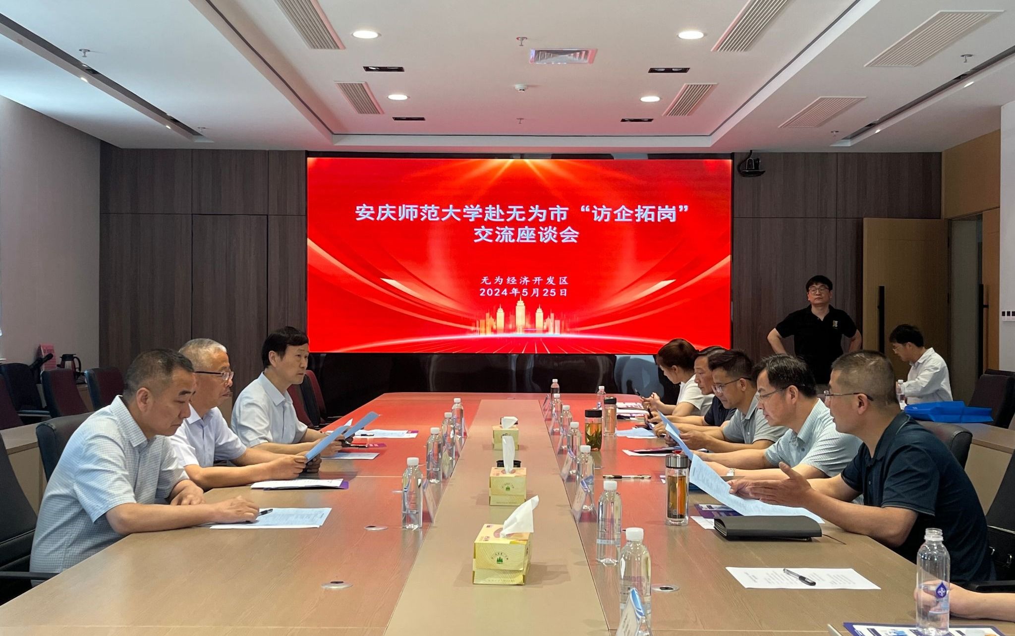 外国语学院在无为经济开发区管委会召开了人才培养和毕业生需求调研座谈会。芜湖徽氏新材料科技有限公司、新亚特电缆股份有限公司、三只松鼠(无为)有限责任公司、三卓韩一精密制造(安徽)有限公司、无为弗迪电池有限公司(比亚迪)等用人单位代表,无为市领导以及市人社局、市经济开发区管委会、市公共就业和人才服务中心、市经济开发区企业服务中心等单位负责人参加了座谈会。