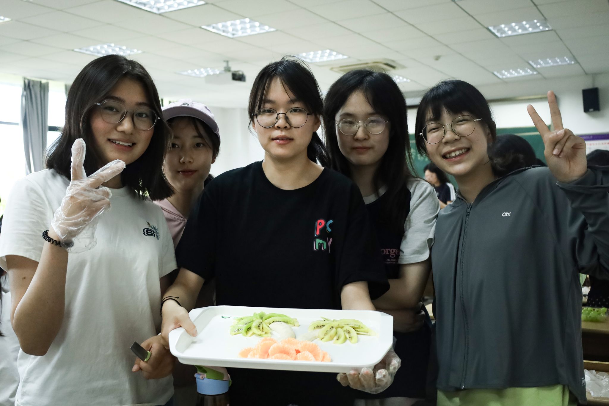 香蕉镂空做成小船、黄瓜切片拼成龙舟、橘子拼接摆出夕阳……5月29日,外国语学院开展劳动教育主题实践活动,近200名学生以班级为单位,分为不同小队进行水果拼盘设计。