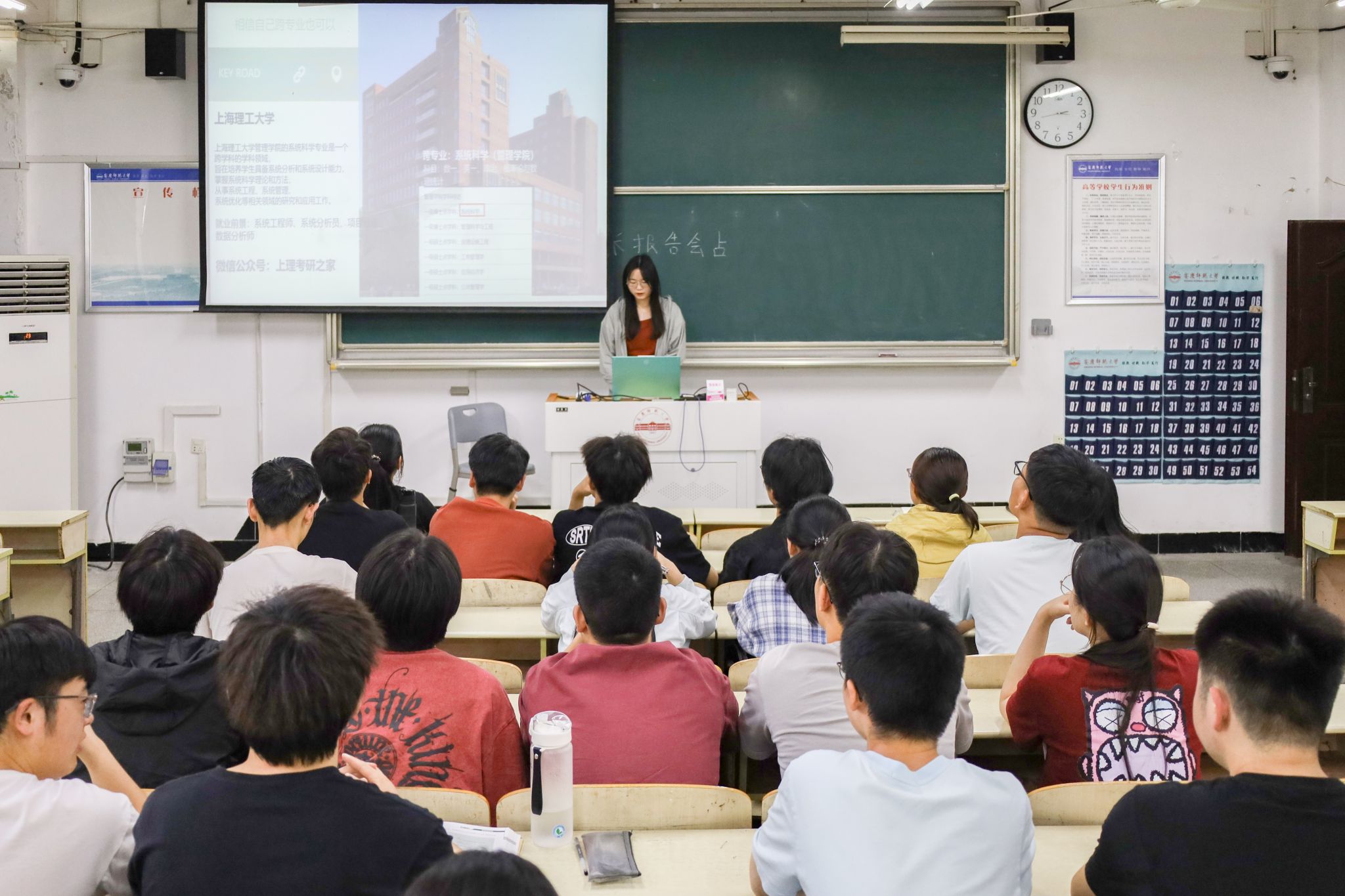 物联网工程专业2020级的周宇手持粉笔,在黑板上为同学们梳理出大学各个阶段及其需要完成的任务。他从担任班干角度讲述了自己如何平衡学习与工作,如何带领班级营造优良学风的故事。他告诉同学们要正确认识学习与工作的关系,合理分配时间并善于利用碎片化的时间,保持高效的学习和工作状态。