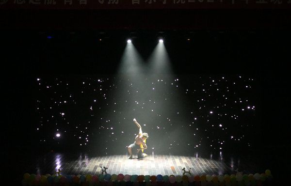晚会现场座无虚席。刚获得安庆市体育舞蹈锦标赛一等奖的街舞团队,以火爆的表演拉开了晚会序幕。音乐学院民乐团、青春合唱团的表演深情欢送毕业生。吉他弹唱《我好像在哪见过你》、对唱《向云端》、独唱《追光者》等,把观众带入美好的抒情意境。独唱《着魔》《火力全开》、音乐短剧《心脏》,用充满力量的歌声和投入的表演燃爆全场。毕业班同学带来了小提琴独奏、竹笛独奏、傣族舞、对唱、独唱等节目,饱含深情,诉说了对母校的无限留念。“白给”乐队用在校期间的最后一场演出,为大学四年画上了圆满的句号。