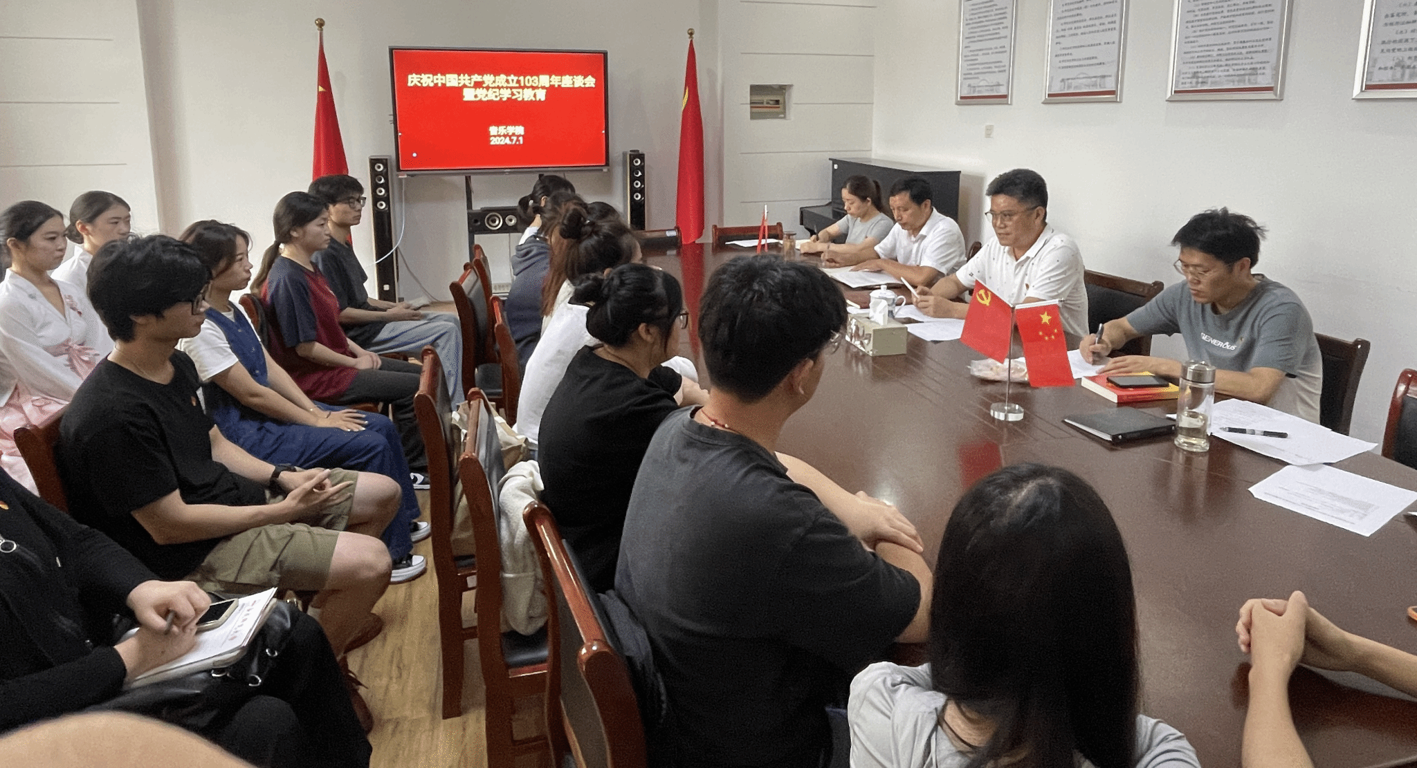 7月1日,音乐学院在艺术楼一楼会议室开展主题党日活动,庆祝中国共产党成立103周年。音乐学院党委书记张铭,党委副书记肖之进,部分教师代表,全体学生党员参加。