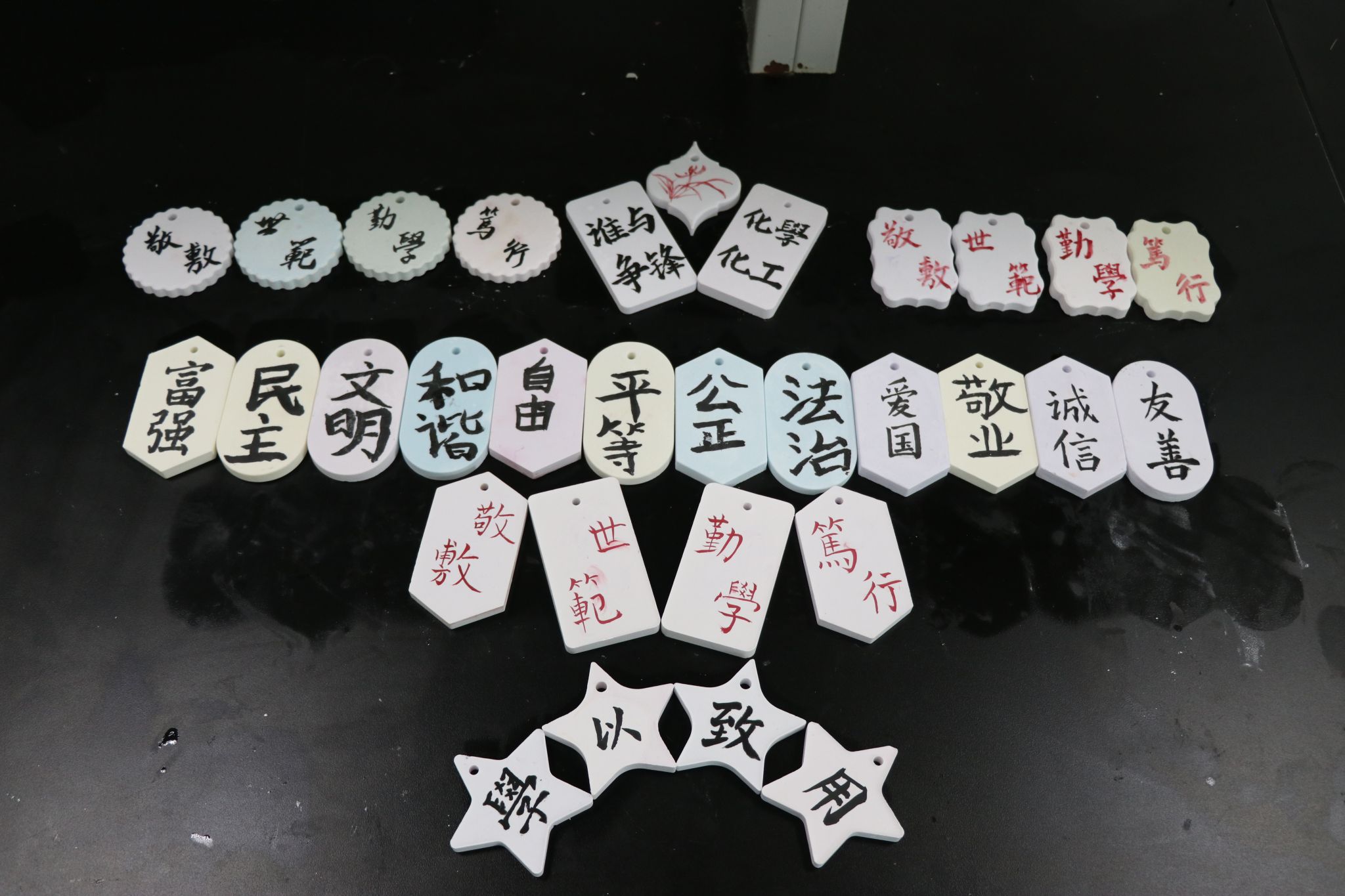 社会主义核心价值的内容出现在了小朋友们的香薰石膏上。将书法课与化学工艺品制作结合的想法来自团队队长、化学工程与工艺专业2022(2)班的陈蕊,“书法作为中华优秀传统文化,在膏‘上’书法课既可以推动文化的传承与创新,又可以激发小朋友们探索化学的兴趣。” 同时,在燎原社区进行返家乡实践的化学工程与工艺专业2022(1)班沈欣雨同学对于此次活动特别期待,她表示,“书法和石膏的结合具有特殊意义,体现了传统艺术与化学学科的融合。书法作为中国独有的艺术形式,承载了千年的历史与文化,是中华民族精神和文化的表达。将书法与香薰石膏结合,可以在保持书法艺术精神的基础上,利用香薰石膏的塑形特性,创造出新的艺术表现形式,使传统书法艺术以更加多元和立体的姿态展现出来。”