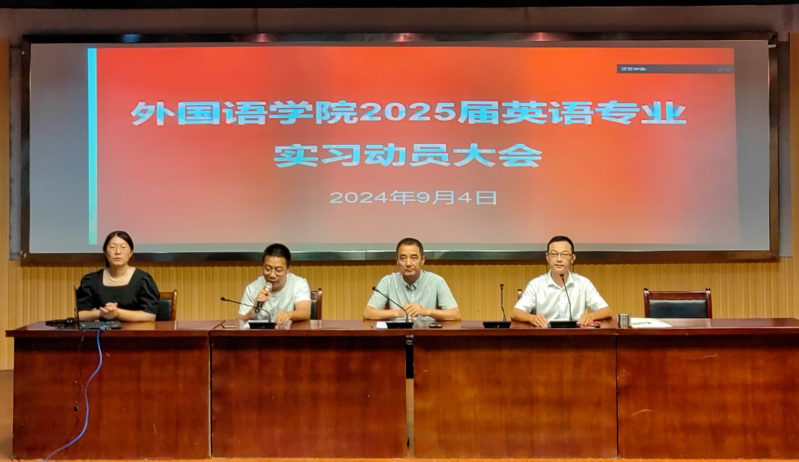 9月4日,外国语学院在E503召开2025届英语专业实习动员大会。副院长江加宏、实习指导教师代表、辅导员及英语专业2025届全体实习生参加会议。