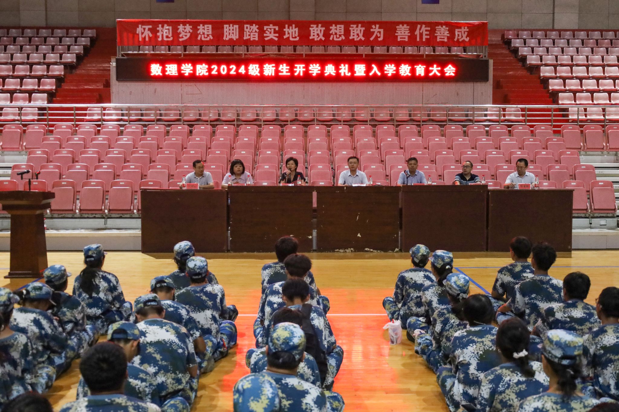 9月18日,数理学院在龙山校区体育馆举行2024级新生开学典礼暨入学教育大会。数理学院党委书记陆健、副院长张海、党委副书记彭芳珍,各系主任、教师代表、新生辅导员、班主任,2024级661名新生出席开学典礼。典礼由彭芳珍主持。