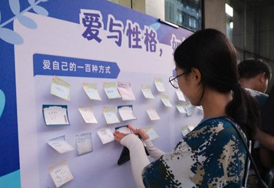 在“爱自己的一百种方式”展板前,学生们逐一将自己心目中的“爱自己的一百种方式”书写在便利贴上。环境科学与工程类专业2024级(2)班的程子越经过一番思考后,提笔写下了“常常旅行”四个字。“高中时期因为学业压力大,没有时间去旅行。上大学后,我希望弥补过去的遗憾,这对我来说也是一种爱自己的方式。”她分享。
