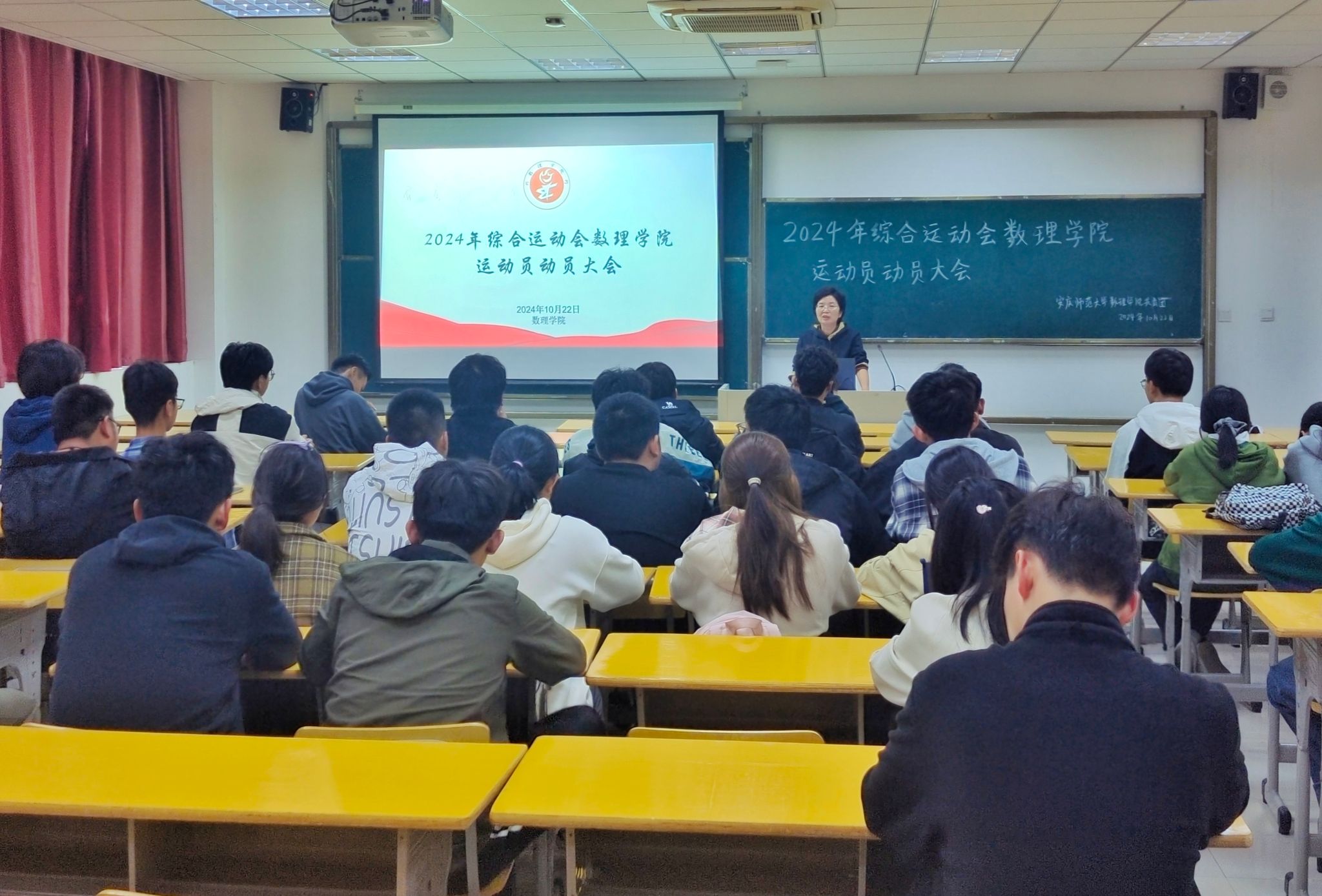 比赛前,数理学院党委副书记彭芳珍为运动员们做动员讲话。她回顾了数理学院在2023年校综合运动会中取得的优异成绩。她表示,学生们要积极参与体育运动,展现出数理学院学子“千磨万击还坚劲”的拼搏精神。同时,要求运动员们要注意安全,学院志愿者们要做好后勤保障。