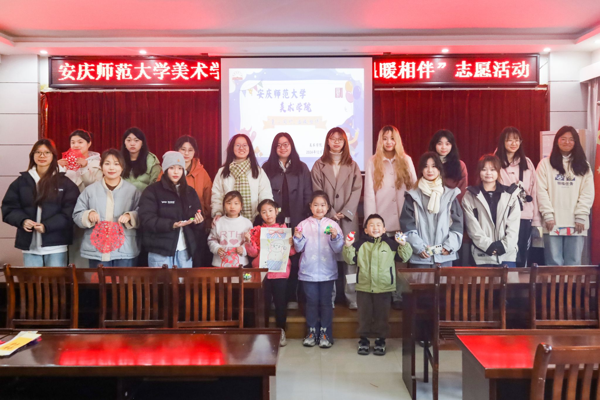 “听爷爷说,今天会有大学生哥哥姐姐教我们画画!”12月1日,迎着冬日清晨的暖阳,胡欣艾小朋友早早来到安庆市宜秀区大龙山镇中心社区新时代文明实践站活动室,映入眼帘的是五彩缤纷的粘土与不织布、形状各异的剪纸与漫画人物、笔法遒劲的书法手作书签……美术学院正在这里开展“童心同行,温暖相伴”志愿服务活动。