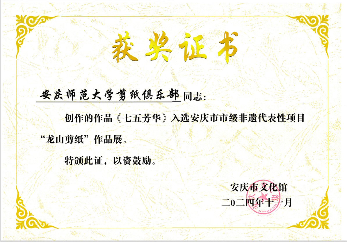 11月1日至11月27日,安庆市非遗代表性项目“龙山剪纸”作品展在市文化馆举办,beat365官网《七五芳华》《中国龙》《龙马精神》《戏曲风韵》《花团锦簇》《花开“福”贵》《福星高照》《鱼戏莲间》《云隐仙踪》《松鹤延年》等10幅公共艺术教育(剪纸)俱乐部学员作品入展。