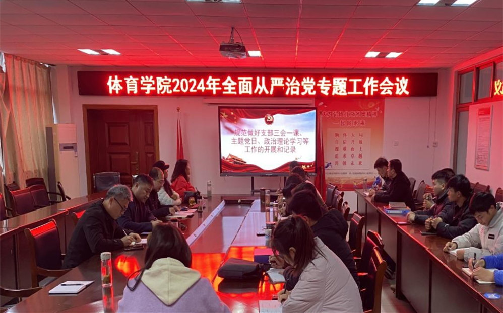 12月4日,体育学院党委在体育馆三楼会议室召开2024年全面从严治党专题工作会议,体育学院党政领导、党委委员、纪委委员、党委秘书(组织员)、各党支部书记、支部委员、各科室负责人、全体辅导员参加会议。会议由体育学院党委书记王玮主持。