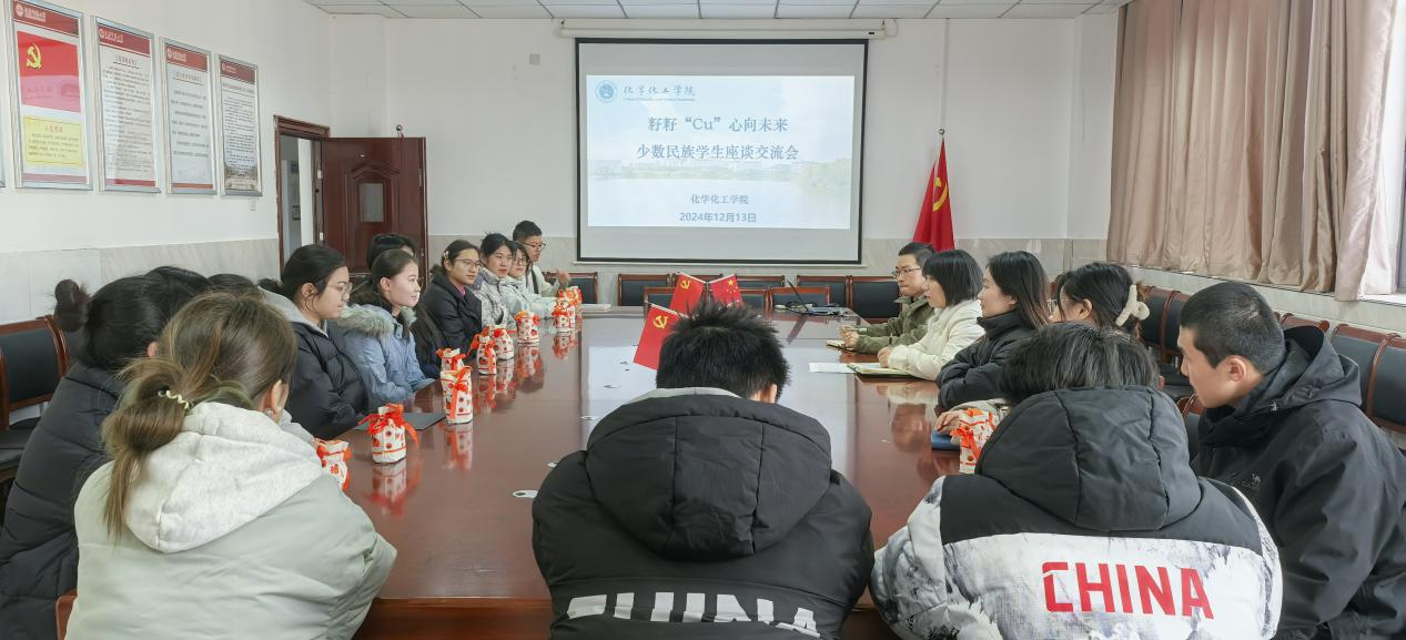 近日,化学化工学院在H304开展“籽籽‘Cu’心向未来”少数民族学生交流座谈会。化学化工学院党委负责人、各年级辅导员及少数民族学生参加此次座谈会。