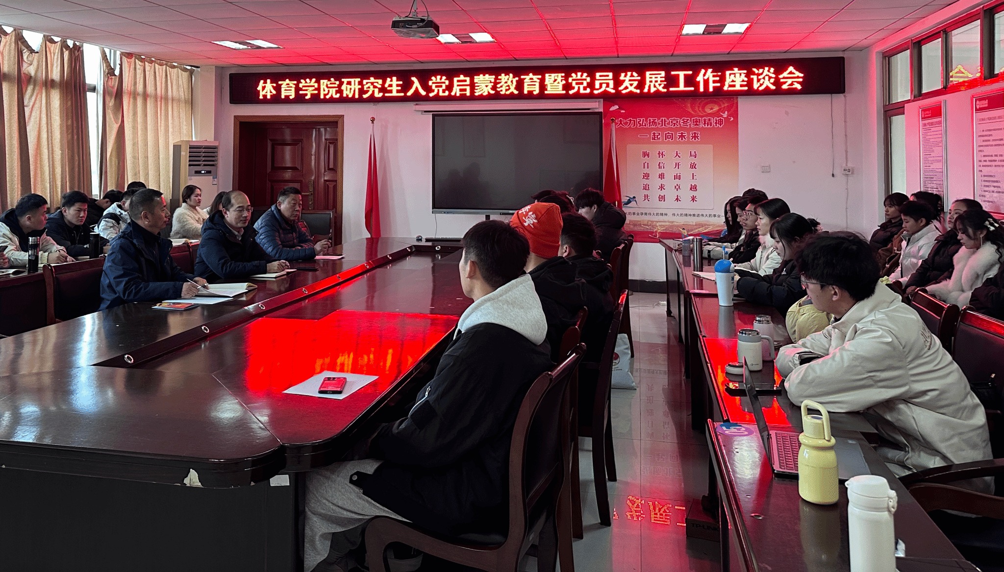 近日,体育学院举办研究生入党启蒙教育暨党员发展工作座谈会,针对近期研究生同学关注的申请入党的程序、要求等内容进行培训、座谈。体育学院党委书记王玮等出席座谈会,2023级、2024级全体研究生参加座谈会。
