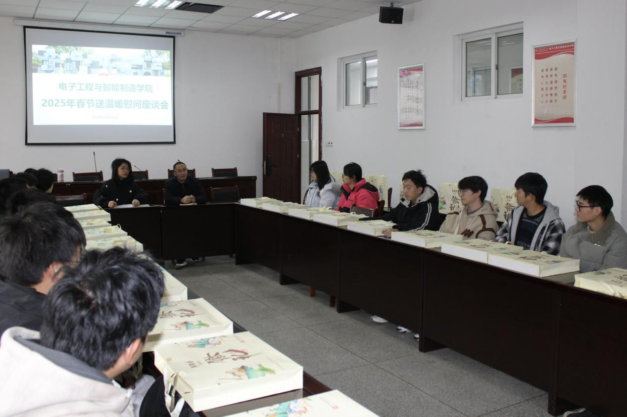 近日,电子工程与智能制造学院在稼先楼南104教室举办春节送温暖慰问学生座谈会。电子工程与智能制造学院党委副书记高栋梁、辅导员代表和部分家庭经济困难生代表参加。