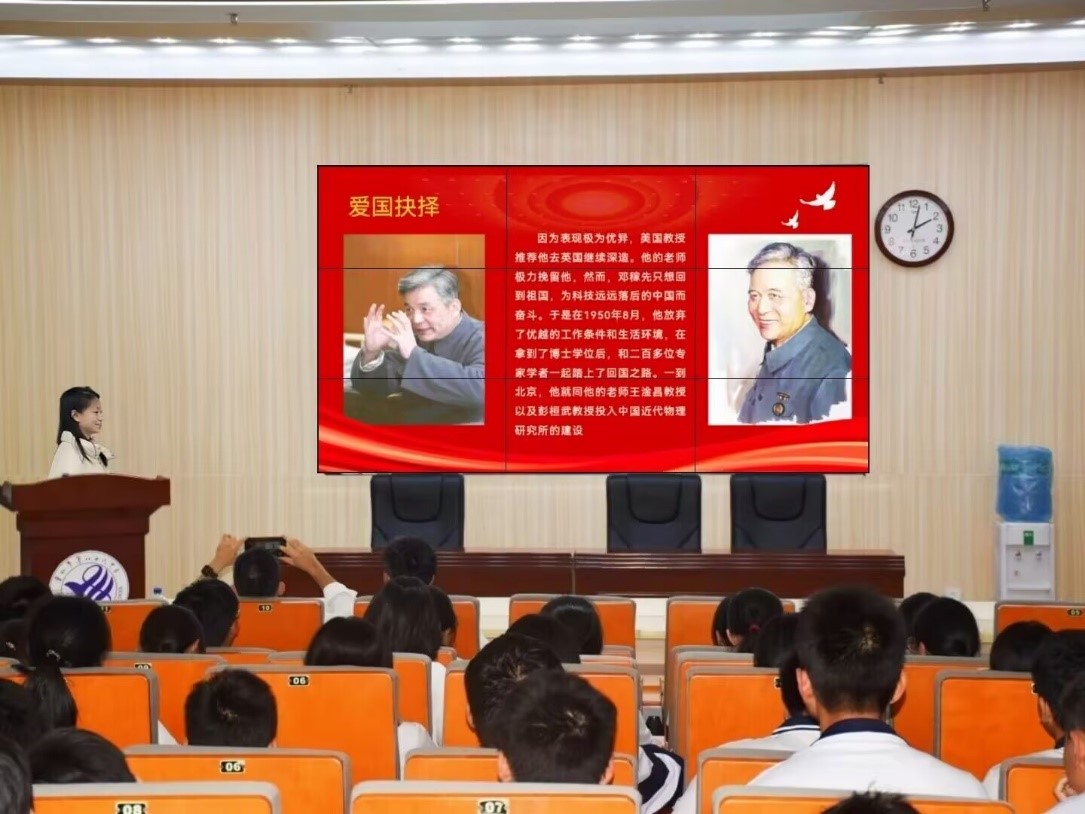 在广州市第八十六中学,宣讲团成员、电子信息类专业2023(3)班的李苏皖以生动的语言和丰富的史料,将邓稼先先生的光辉事迹娓娓道来。