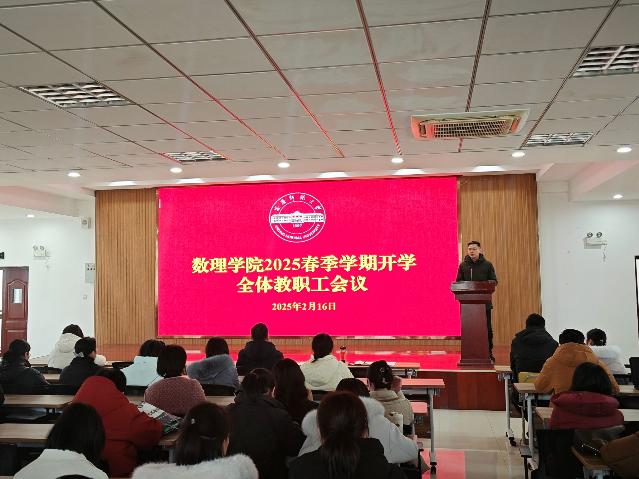 2月16日,数理学院在I楼401报告厅召开2025年春季学期开学全体教职工大会。数理学院党委书记陆健,院长张海,副院长易明芳、殷周平和全体教职工参加会议,会议由陆健主持。