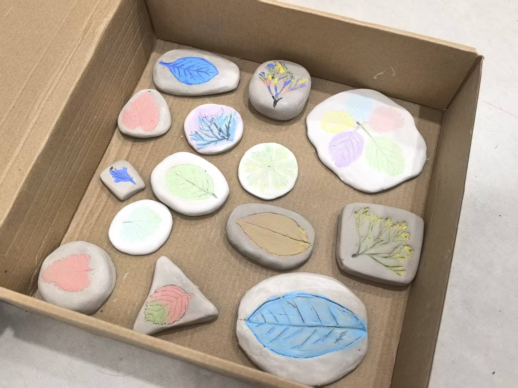 创作现场气氛非常活跃,素白瓷泥与银杏、枫香等自然素材相映成趣,学生们俯身于泥板前,指尖游走于泥土起伏的肌理间,叶片脉络在碾压中重生为素坯上的诗意印记。美术学专业2024(2)班方晓茹感叹:“触摸泥土的过程仿佛与自然对话,每一道刻痕都是独一无二的诗句。”经过揉泥、修形、施釉等工序,最终20余件作品在展台上错落陈列,素坯上深浅不一的指纹与刻痕,既凝固着传统工艺的匠心,也彰显了青年学子的创新思维。