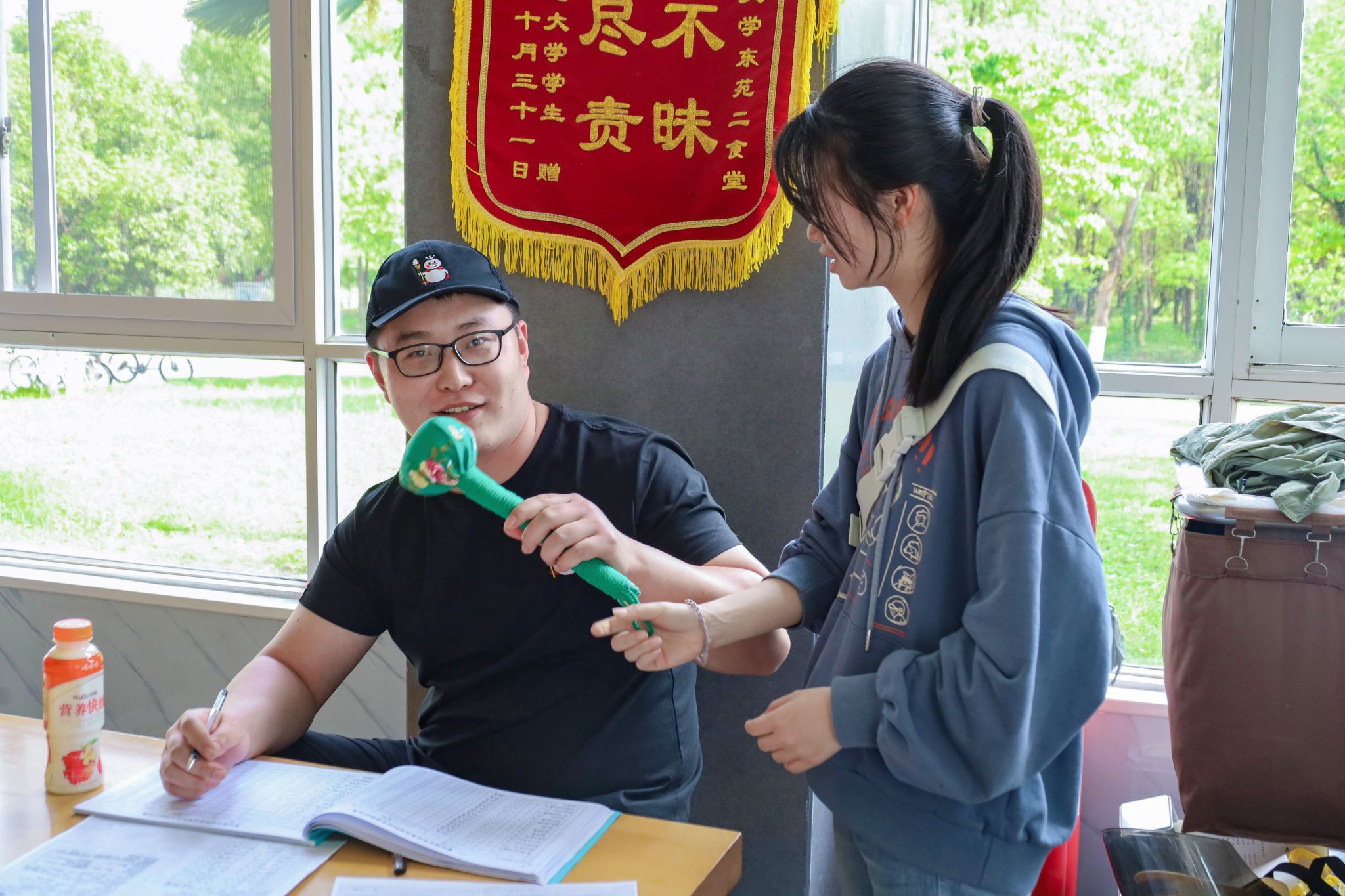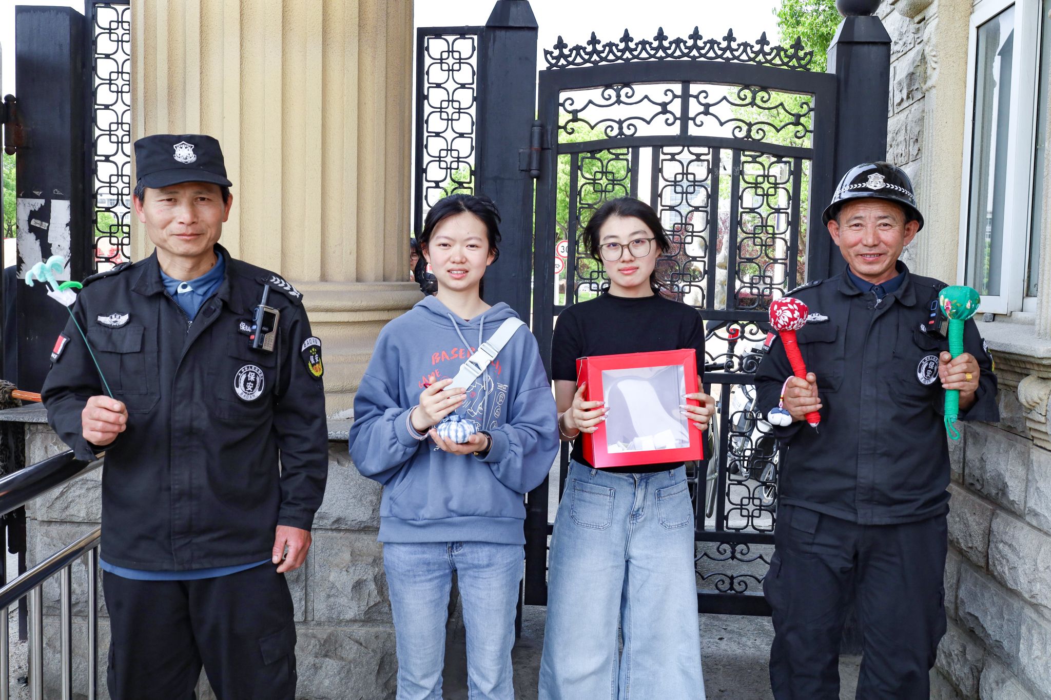 从学校东、西苑食堂到综合教学楼,从校门门卫到宿舍管理员,学生们带着手作礼物、捧着抽奖箱走访校园各个角落,邀请食堂师傅、环卫工人、宿舍管理员等“校园守护者”参与抽奖。正在教学楼检修投影仪的斯师傅被学生们团团围住,这位戴着助听器、腿脚不便却坚守岗位二十余年的守护者,在抽取获得一等奖后反复摩挲着这份走心的“定制礼物”。“学生们手巧心更细!我每天弯腰修设备七八个钟头,这锤子捶两下舒坦多了。”他当场试着轻捶后腰,对学生们竖起大拇指:“第一次收到学生给我礼物,比拿奖金还高兴!”