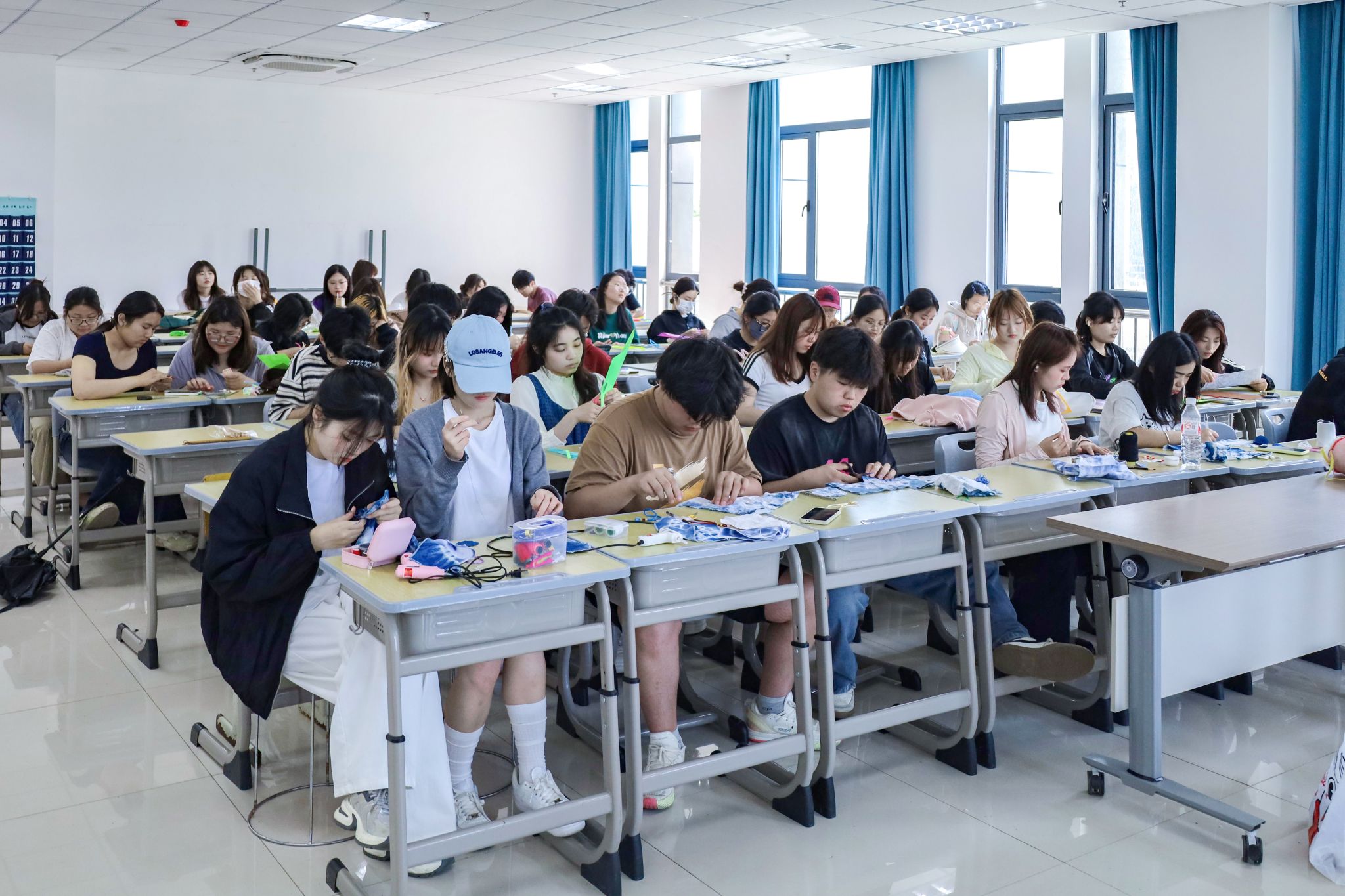 扎染方巾在指尖裁剪并塑形成柿子包、棉麻布料缝袋填入艾草丝线密缠成养生锤、彩色扭扭棒翻折成郁金花簇在掌心绽放……设计学类专业2024(2)班的王婧怡捏着浸透染液的棉布轻轻挤压,“柿子象征‘事事如意’,我们选用传统扎染技艺,希望把一布一染皆有温度的匠心传递给劳动者。”伴随剪刀裁剪不织布的“咔嚓”声、银针穿过扎染布的细响、扭扭棒弯折的窸窣声,60余件融合传统工艺与现代设计的手作逐渐成形。