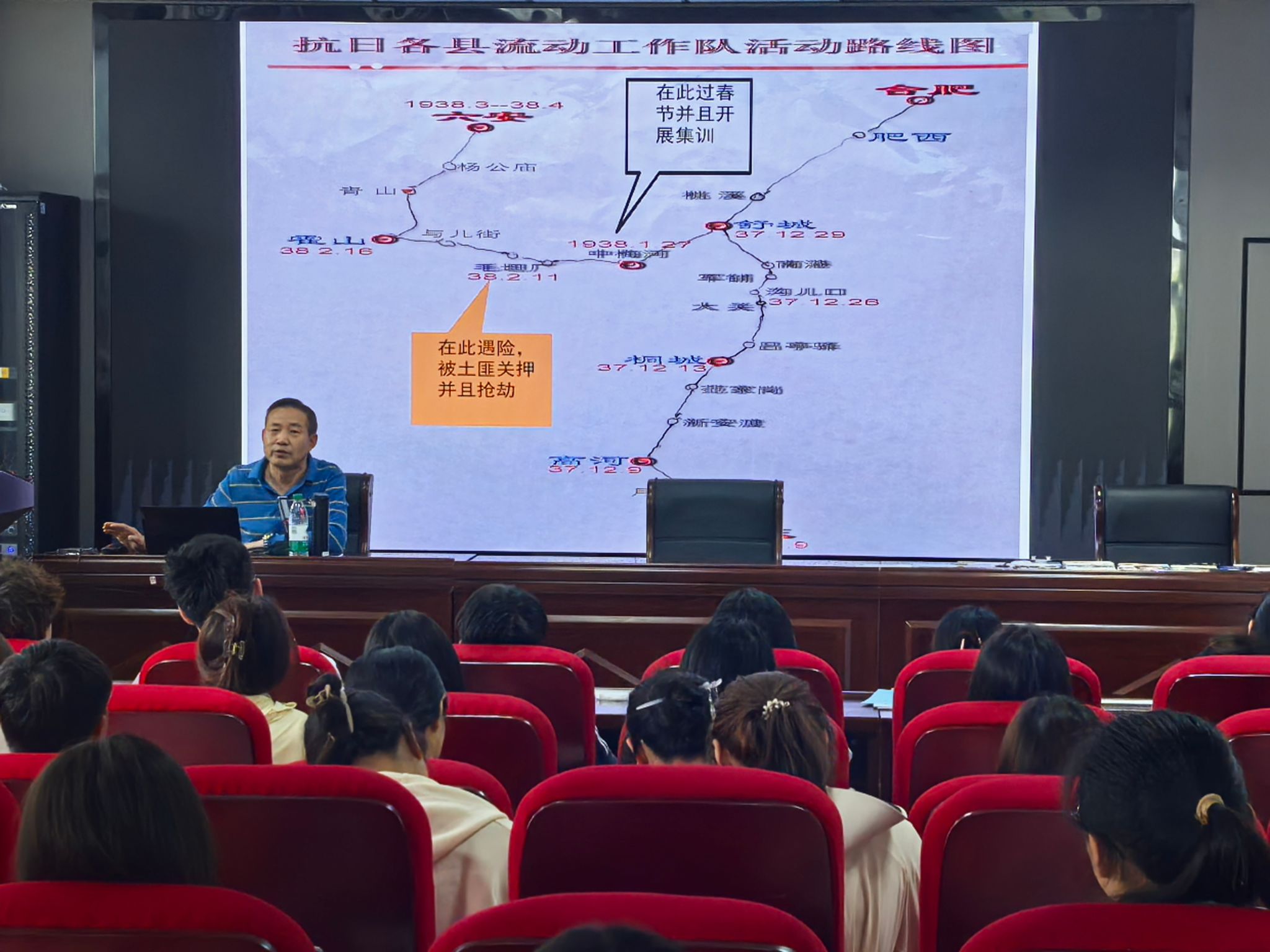课上,吴毅安以习近平总书记关于讲好红色故事的重要指示为切入点,围绕安徽青年学生抗日救亡工作团的历史,从时代背景、安徽青年学生抗日救亡工作团的组建历程、深入皖西山区开展民众动员的实践过程,以及抗日救亡工作团的历史意义与抗战精神的时代价值等多个维度进行讲解。他通过展示详实的史料和生动的案例,系统呈现了工作团的英勇事迹,深刻阐释了中国共产党人民战争理念的战略意义,让同学们清晰认识到抗战精神在新时代的传承价值与实践要求。