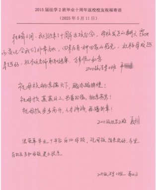 李丹主持座谈会。张宗高分享了与校友们共同成长的难忘经历。与会校友纷纷发言,回忆了在校学习的点滴时光,畅谈毕业十年间的工作经历与人生感悟。校友们结合自身在司法机关、律所以及企业法务岗位的工作经验,围绕法学实践教学、校企协同育人、校友资源共享等提出了宝贵的建议和意见,现场气氛热烈融洽。活动还特别设置了“手写祝福寄语”环节,校友们在明信片上写下对母校的祝愿与对学弟学妹的期许,字字真挚,句句情深。