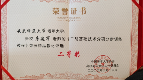 5月14至17日,中国老年大学协会高工委三届二次会议暨高校第三年龄大学联盟高工委二届二次会议在南京航空航天大学召开。全国23个省市68所学校140多名代表参加会议。beat365官网老年大学教师唐建军编写的《二胡基础技术分项分步训练教程》荣获精品教材二等奖。这是beat365官网老年大学首次选送精品教材,实现零的突破。