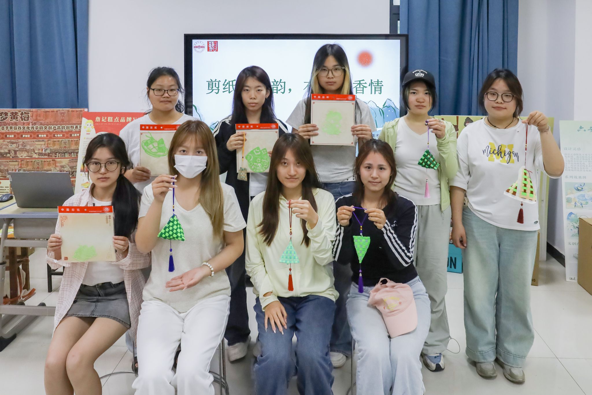 手持刻刀,微微侧身而坐,设计学类专业2024(3)班的滕婧怡全神贯注地雕刻手中的绿色卡纸,刻刀轻旋间,一枚栩栩如生的“剪纸粽”跃然而出。“将端午元素融入剪纸,让非遗技艺与千年节俗对话,是一次奇妙的文化碰撞体验。”滕婧怡分享道,她坦言亲手用剪纸“讲述”端午故事,真切触摸到了传统文化如何通过精妙的技艺载体得以具象化表达和传承。