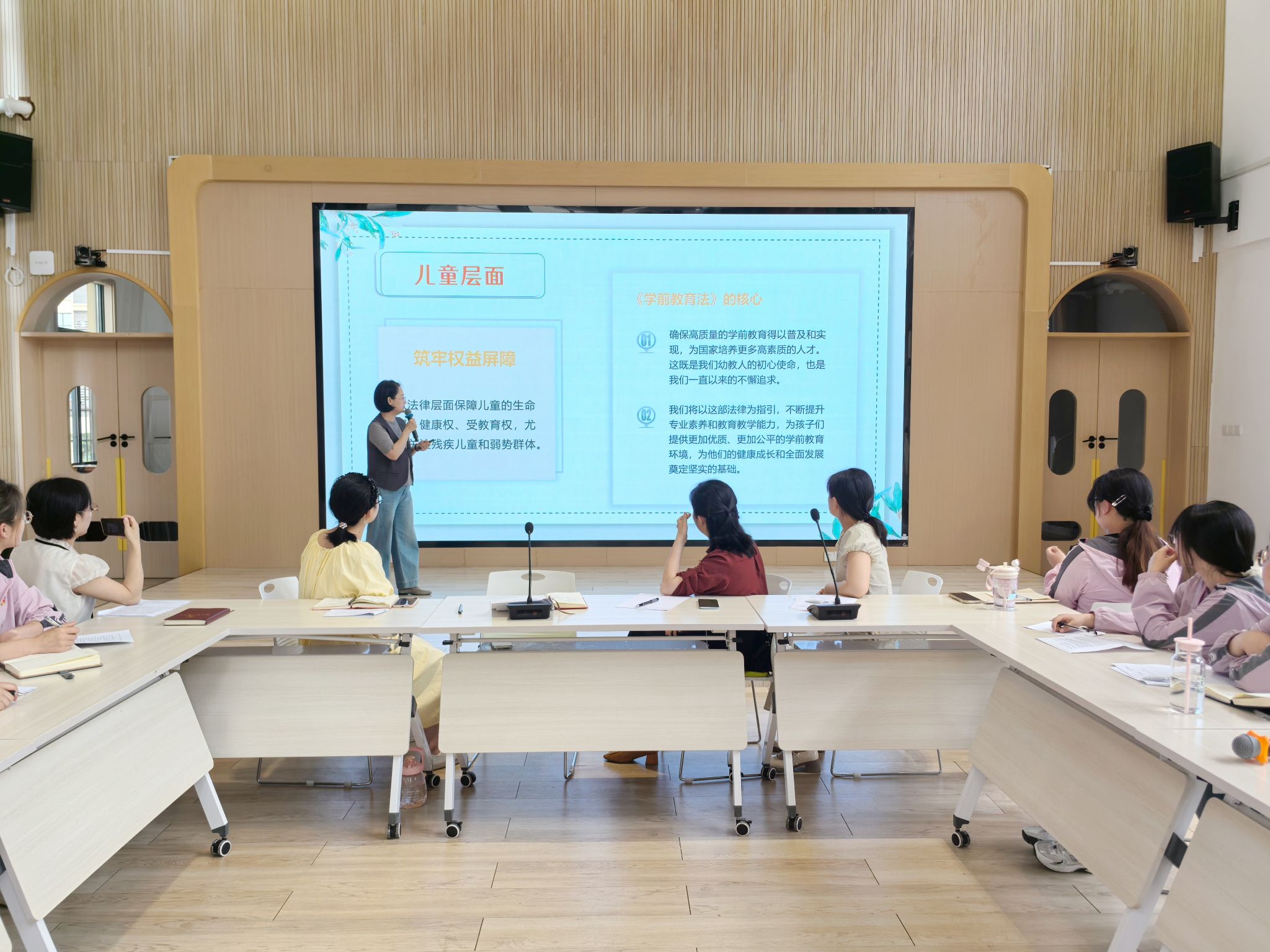 活动由附幼党支部书记、园长姚萍主持。她立足《中华人民共和国学前教育法》立法背景与时代要求,解读了法律框架的核心内容,提出以敬畏之心守护童年,以专业之力破解困境,以协同之智构建生态。姚萍强调,幼教工作者须将法律条文转化为教育实践,以法律规范教育行为,构建儿童成长的法治化生态圈。