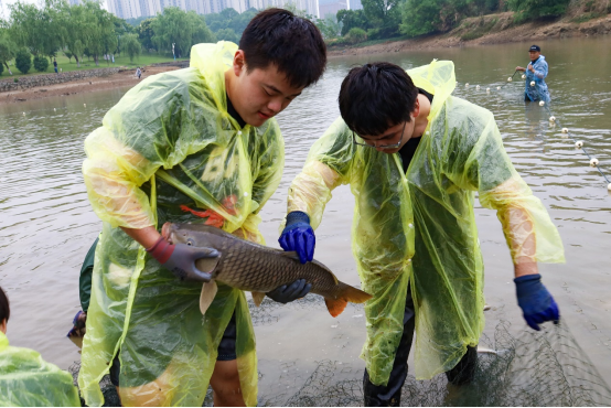 撒网、抬网,只见双龙湖边水花四溅,鱼儿翻腾,随着渔网不断收拢,一网又一网的野生鱼被捞入网中……5月28日,为欢送2025届毕业生,共享劳动成果,学校举办校园捕鱼劳动教育实践活动。300余人次的学生参与其中,采用“撒网捕捞”方式,历经撒网、收网、搬运、计重等多个环节,共计捕获鲜鱼约6000公斤。