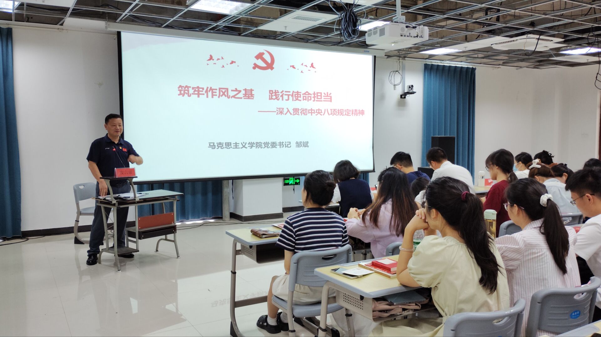 大会在庄严的国歌声中拉开帷幕。马克思主义学院党委书记邹斌以“筑牢作风之基 践行使命担当——深入贯彻中央八项规定精神”为题,为毕业生党员讲授党课。他结合中央八项规定及其实施细则精神,深刻阐释了新时代加强作风建设的重要意义,强调青年党员要始终以“永远在路上”的政治自觉,将纪律规矩内化于心、外化于行。他勉励全体毕业生党员要坚定理想信念,做永葆初心的追梦人;要提升能力本领,做名副其实的接班人;要强化责任担当,做砥砺奋进的实干家;要坚持自我革命,做共产党人的“心学”践行者。