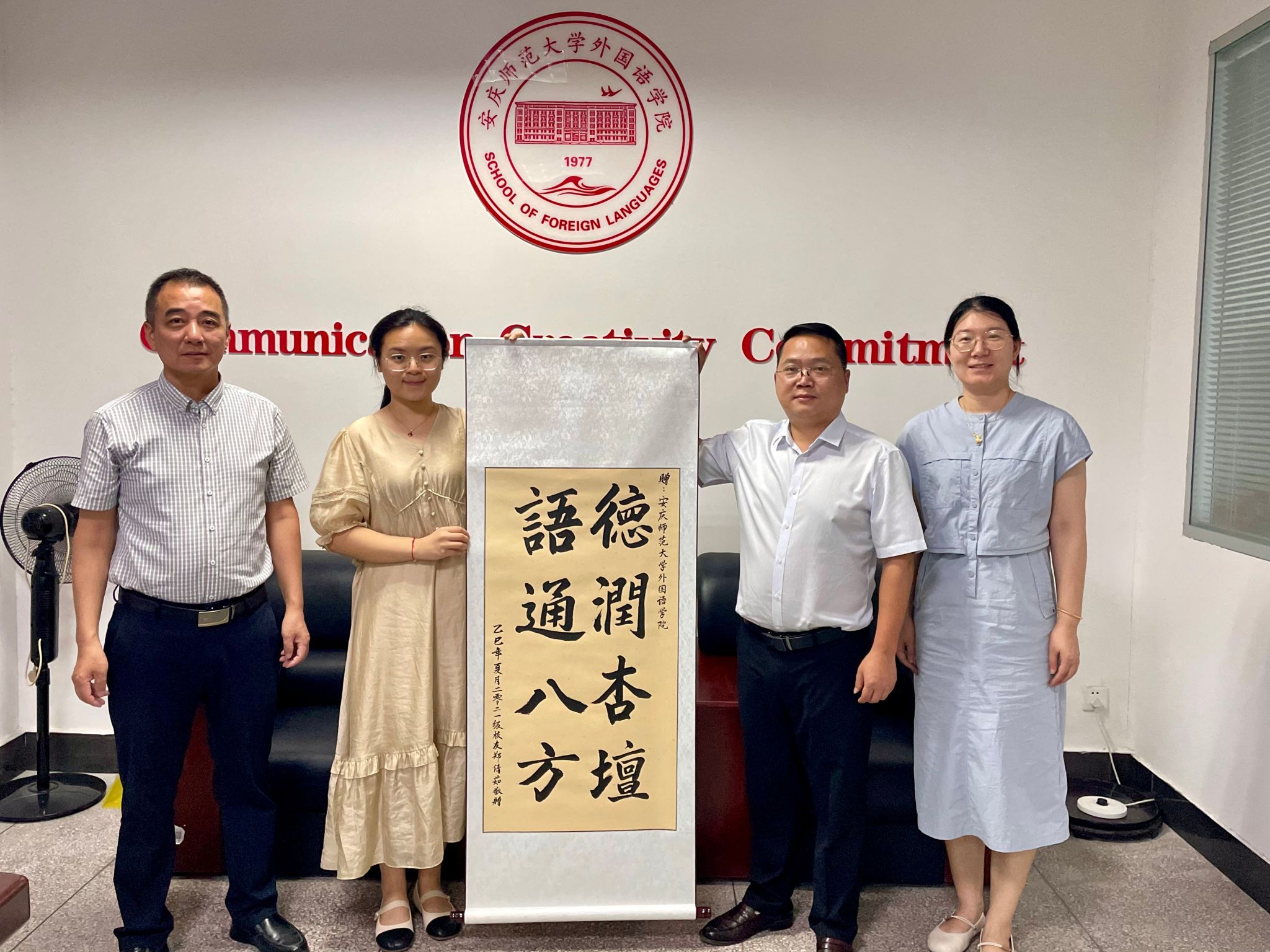 依依惜别之际,学子深情反哺。毕业生代表饱含对外国语学院的感恩与眷恋,精心创作并敬献了一幅遒劲有力的书法作品。宣纸之上,“德润杏壇,语通八方”八个大字墨香四溢、力透纸背。“德润杏壇”是对学院立德树人、春风化雨培育之恩的崇高礼赞,彰显了外院精神的深厚底蕴;“语通八方”则一语双关,既点明了外语专业沟通世界的核心使命,也寄托了学子们以语言为桥、融通中外文化、服务国家发展的远大志向。