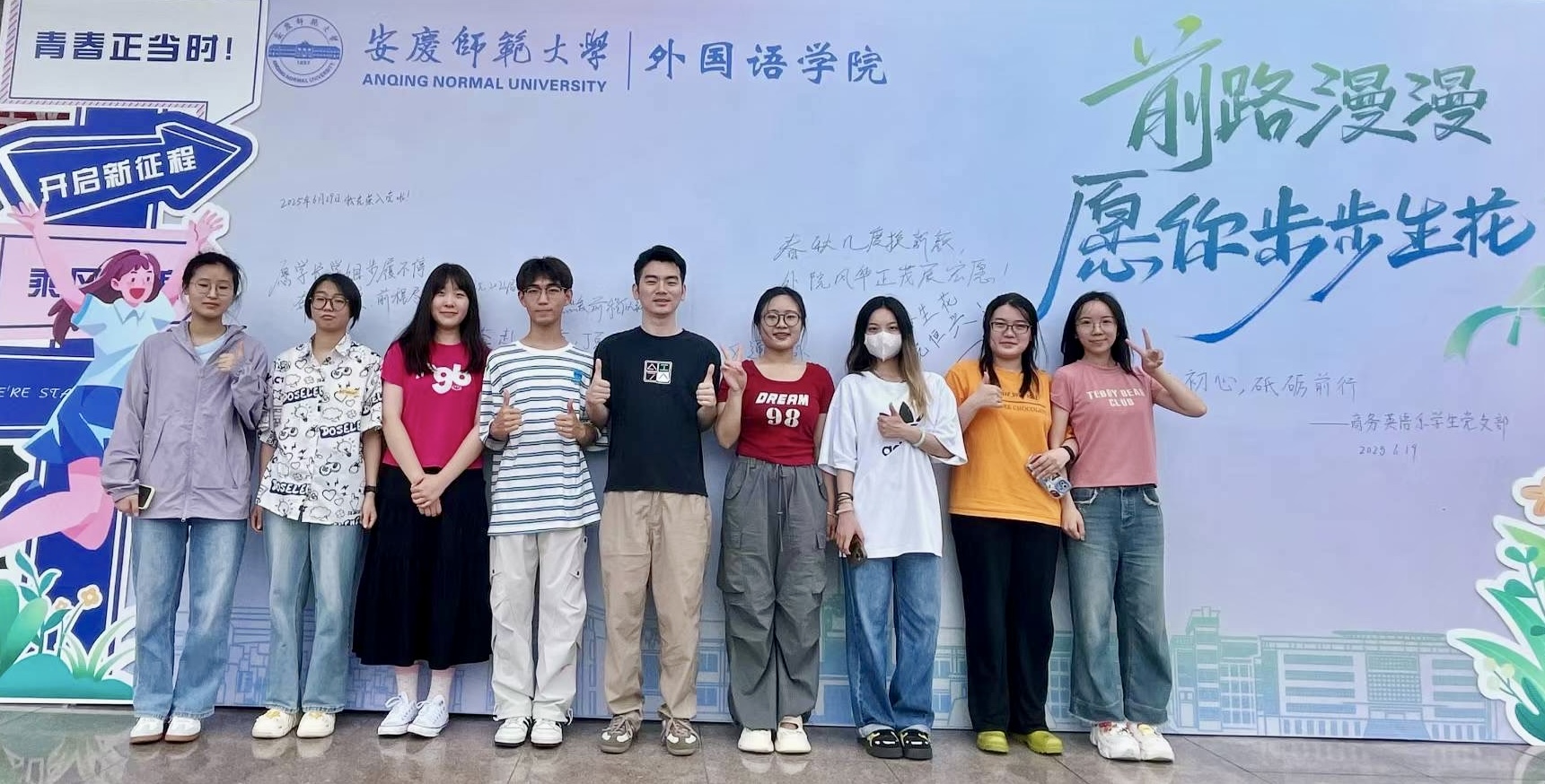 学校毕业典礼外国语学院分会场气氛庄重而热烈,毕业生代表线上线下同步参与主会场盛况及学位授予仪式。仪式结束后,“青春纪念墙”前人头攒动,“不忘初心,砥砺前行”“前程似锦,未来可期”“离别总是匆忙又深情”……字里行间满载着对母校的感恩与对未来的憧憬。学子们驻足、书写、合影,让这面墙成为青春记忆的永恒载体,也彰显了外语学子沟通世界的志向。