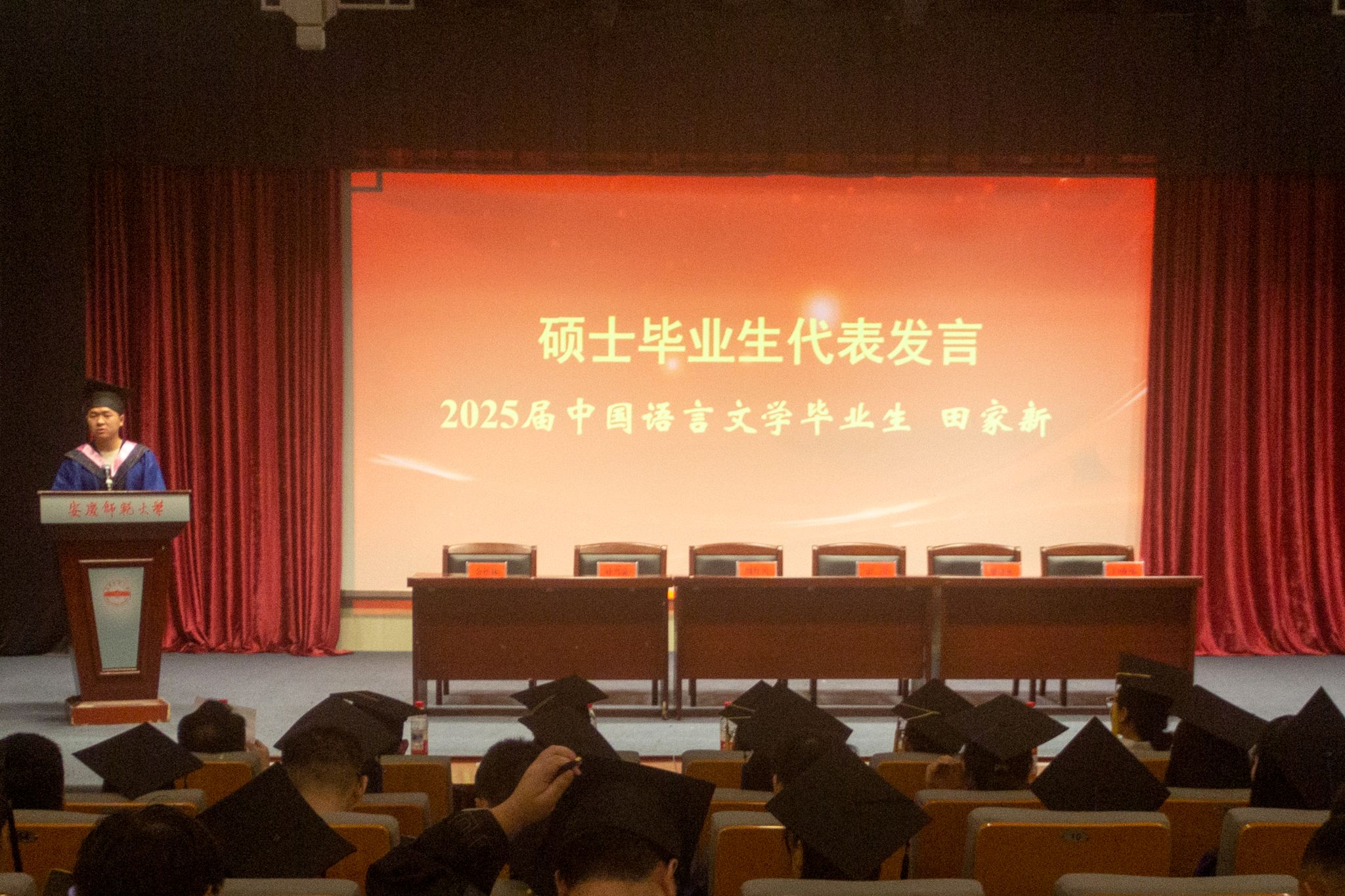毕业生代表,2021级历史学3班刘敏分享了大学四年从青涩懵懂到矢志追梦的蜕变历程,号召同学们“在文史典籍中寻找生命坐标”;2022 级中国语言文学硕士田家新用“五次失利仍不放弃,第六次终获成功”的成长经历,诠释了“坚定追求”的意义。