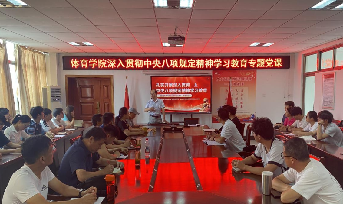 6月25日,体育学院党委书记王玮在体育馆三楼会议室,以“扎实开展深入贯彻中央八项规定精神学习教育”为主题讲授专题党课。体育学院田径、球类两个教师党支部和体育教育专业学生党支部全体党员、入党积极分子聆听本次专题党课。