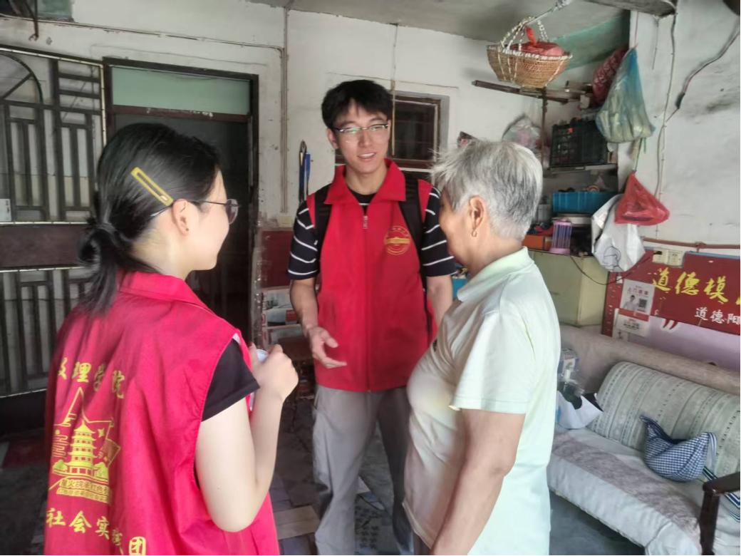 在整理问卷时,一组数据引发了队员们的深思:虽然78%的受访者通过影视作品了解红色历史,但仅有29.67%的人参与过线下讲座活动。这说明红色教育需要更多沉浸式体验。这份思考首先在程家墩社区化为温情实践。正值中国共产党建党纪念日,实践团一行六人来到程家墩社区,开展敬老关怀主题实践活动。队员们分成两组,带着鲜花与敬意,分别走访慰问了社区老党员和独居老人。 活动中,队员们与老党员促膝长谈,聆听他们讲述革命年代的峥嵘往事;与独居老人聊聊家长里短,儿孙近况,关心询问他们的生活状况和身体情况。社区内,由社区党群服务中心组织的义务理发、健康检测等便民服务同步开展,为居民提供便利。老人们对队员们的到来倍感亲切,热情询问他们的学习生活情况。通过亲身参与社区服务与深入倾听老人们的讲述,抽象的“为人民服务”的宗旨在队员们心中变得无比鲜活而具体。一位队员表示:“在建党节参与这样特殊的实践意义非凡。老党员们的经历、社区细致入微的服务,还有老人长辈们真挚的关怀,让我们深刻体会到为人民服务的精神,就蕴含在这些平凡温暖的日常点滴之中。”