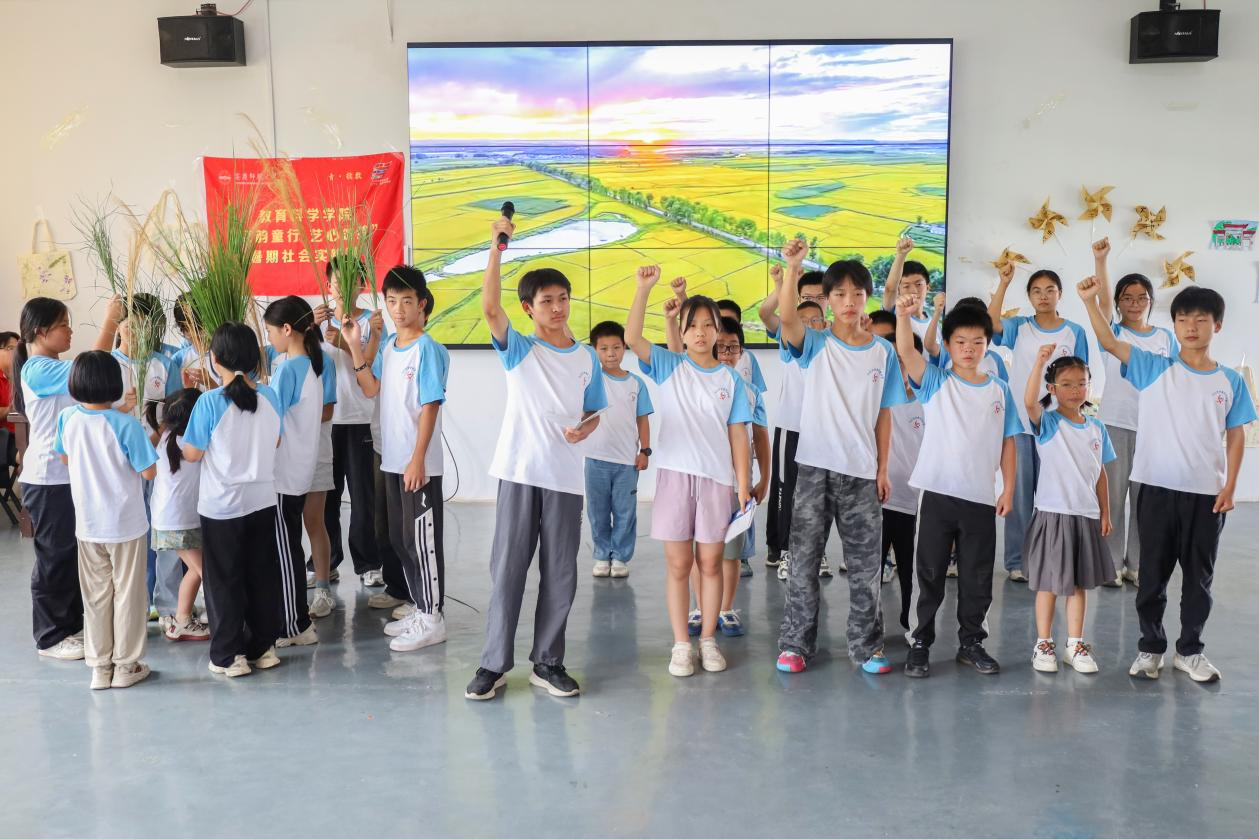 夏令营成果汇报表演节目类型多样、内容丰富励志。歌曲《稻香》展现积极向上的生命哲理,诗朗诵《月光下的中国》饱含家国情感,情景剧《禾下乘凉梦》尽显科学、劳动之美……孙小淇、崔赵薇、俞成敏等实践团成员在《唱支山歌给党听》的每个动作中倾注对党和国家的热爱。“舞蹈结合红色革命文化的形式能让营员从歌词中汲取奋进力量。高校青年的专业素养与乡村孩子们的纯真心灵碰撞出的是相互促进,教学相长的火花。”团队负责人、学前教育专业2024级研究生崔赵薇表示。