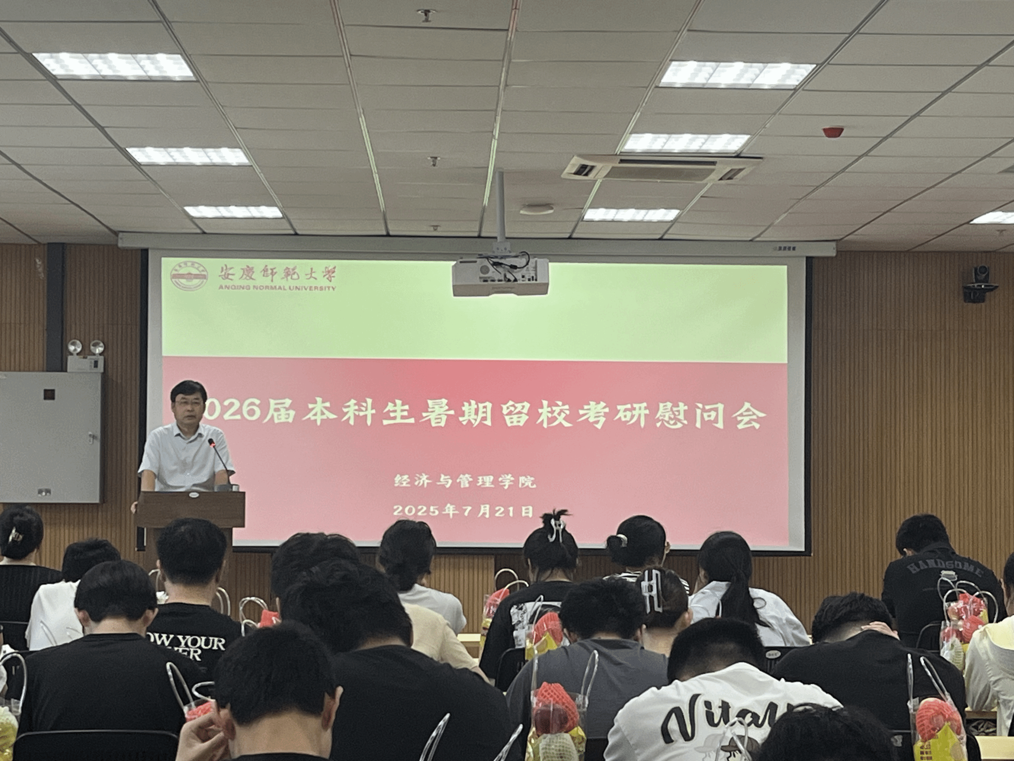 7月21日,经济与管理学院在M112报告厅举办2026届暑期留校考研学生慰问会。经济与管理学院党委书记刘燕杰、2026届全体辅导员老师、2026届暑期留校考研学生参加此次慰问会,会议由经济与管理学院团委负责人王清主持。