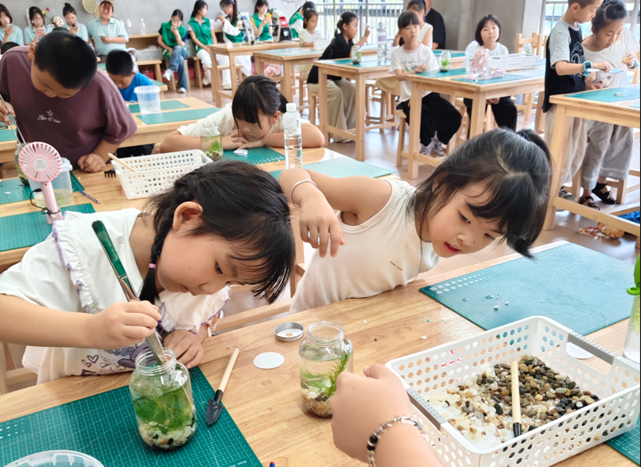 聚焦动手实践,“生态瓶 DIY 制作”活动让孩子们化身“小小生态设计师”。“植物给鱼虾提供食物和氧气,鱼虾的排泄物被细菌和螺分解成养分,又能被植物吸收——这就是生态系统循环的奥秘!”生命科学学院教师潘扬向孩子们一一讲解了大自然生态循环的奥秘。在团队成员的帮助下,孩子们将石砾、水生植物、小型鱼虾、硝化细菌依次放入玻璃瓶,再加入装饰小摆件,构建起一个自给自足的微型生态系统。“孩子们非常有创造力,他们设计的生态瓶都非常美观且有趣。”潘扬补充道,通过亲手制作生态瓶,孩子们不仅理解了生态平衡的重要性,还培养了观察力和耐心,激发了他们对自然生态的浓厚兴趣。