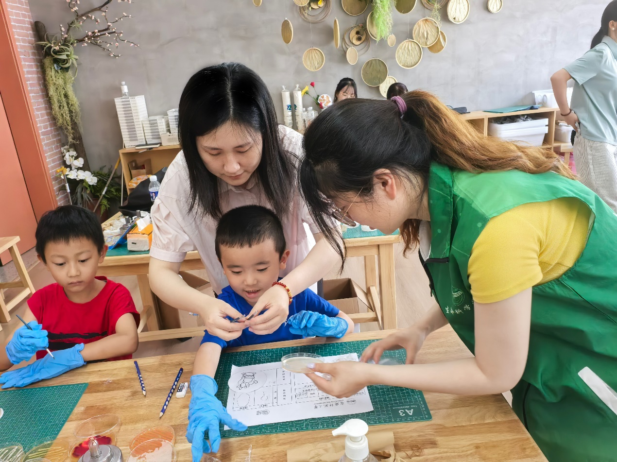 微生物也能用来作画?与严谨的实践操作不同,“微生物艺术画”活动将科学与美学巧妙融合,孩子们以培养基为“画板”,用接种环蘸取能释放不同色素的微生物,用青霉菌“画”出青色线条,胶红酵母“点”出橙红斑点,创作专属的“微生物画作”。指导孩子们操作的同时,杨紫晴将亚历山大・弗莱明与最早微生物画的故事向孩子们娓娓道来,“微生物不仅是科学研究的对象,还能成为艺术创作的‘颜料’,离我们的日常生活并不遥远。”