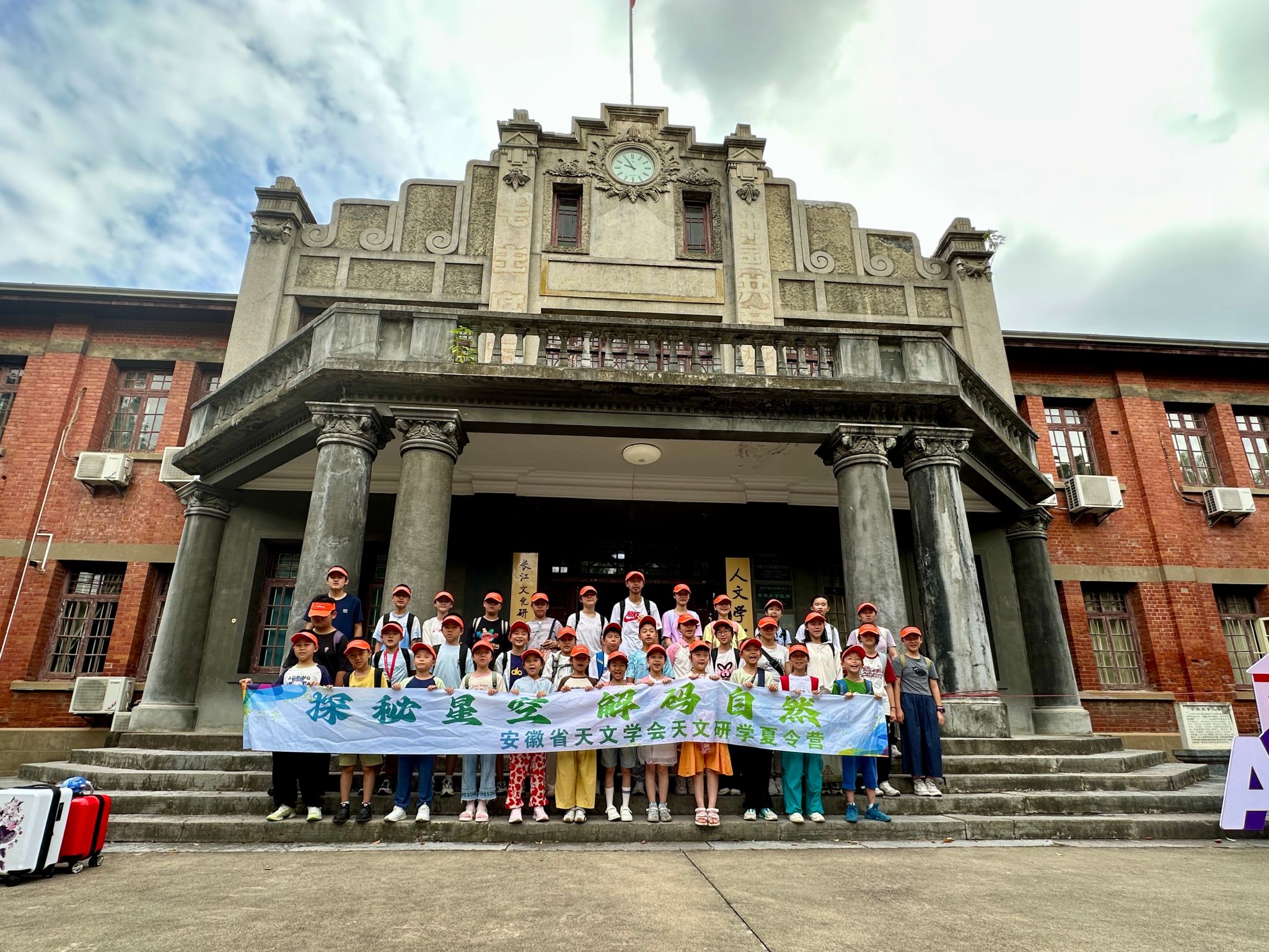 7月26日上午,营员们齐聚菱湖校区红楼,在楼前广场合影留念。随后,在数理学院老师和工作人员的带领下,营员们满怀期待地登上前往池州市东至县的“时空考察团”筑梦大巴,开启了为期两天的探索之旅。