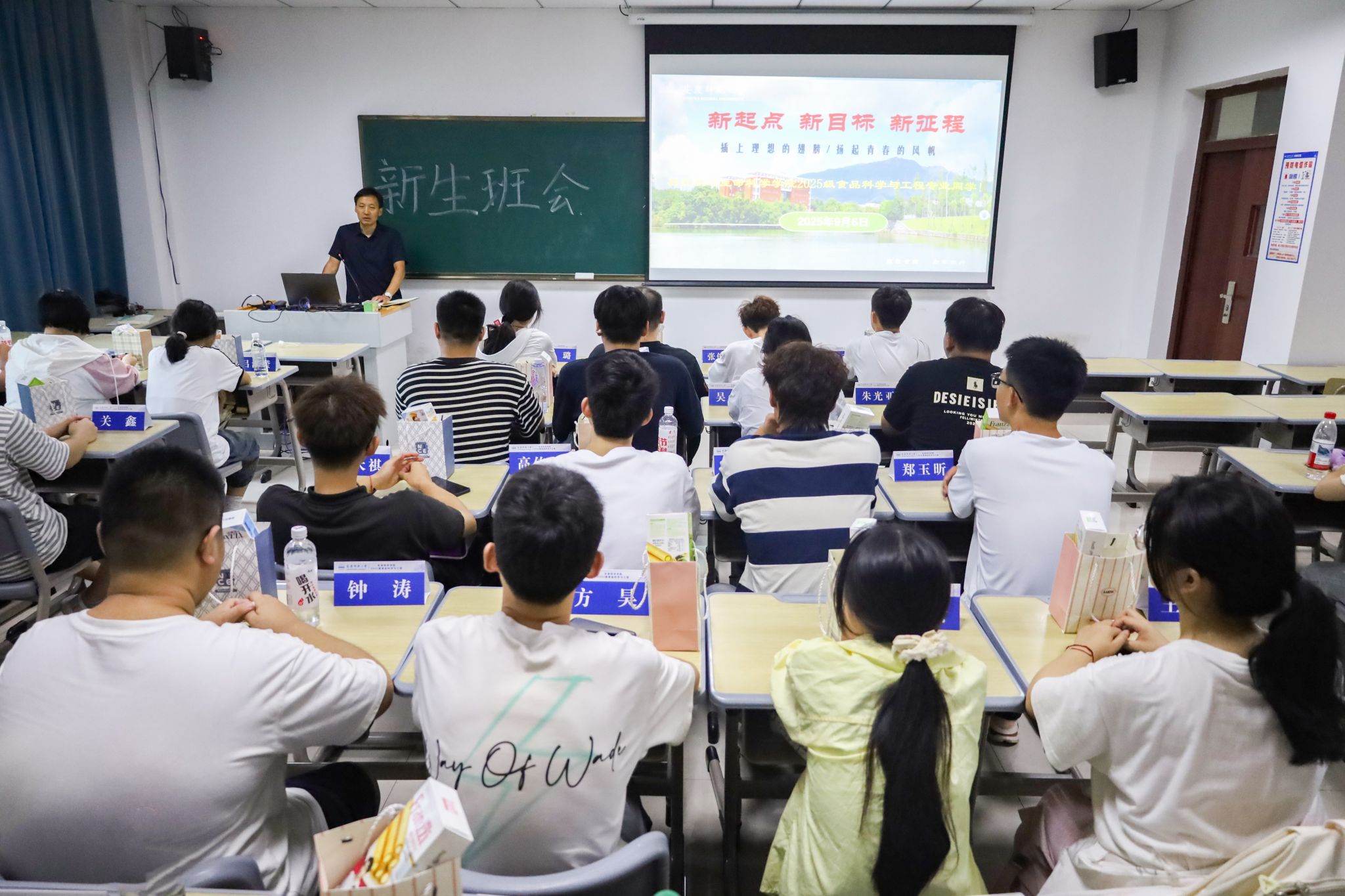 9月6日,生命科学学院食品科学与工程专业2025级的30名新生齐聚一堂,一场别开生面的新生班会于k503举行。与传统班会不同,这场由新生辅导员张万茂主持的班会,因“席卡首用”“六样定制礼物”等创新设计,让刚入校园的新生倍感温暖,也为他们的大学生活埋下“严而有爱”的伏笔。