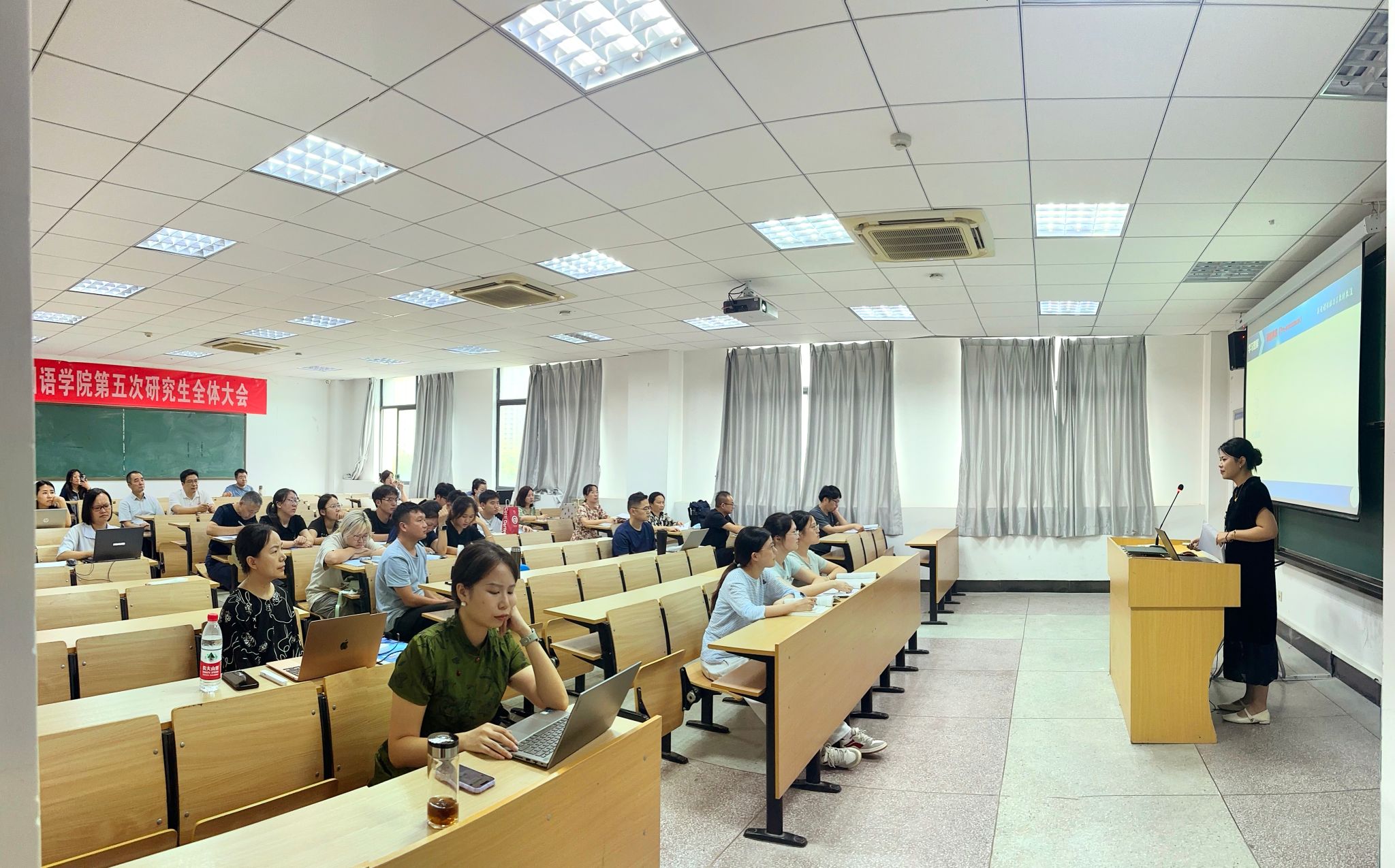 9月17日,外国语学院在E316 教室举行第七届教师智慧教学大赛学院选拔赛。教务处副处长张俊生莅临指导,外国语学院院长江加宏主持赛事,各专业负责人和教研室主任担任评委。