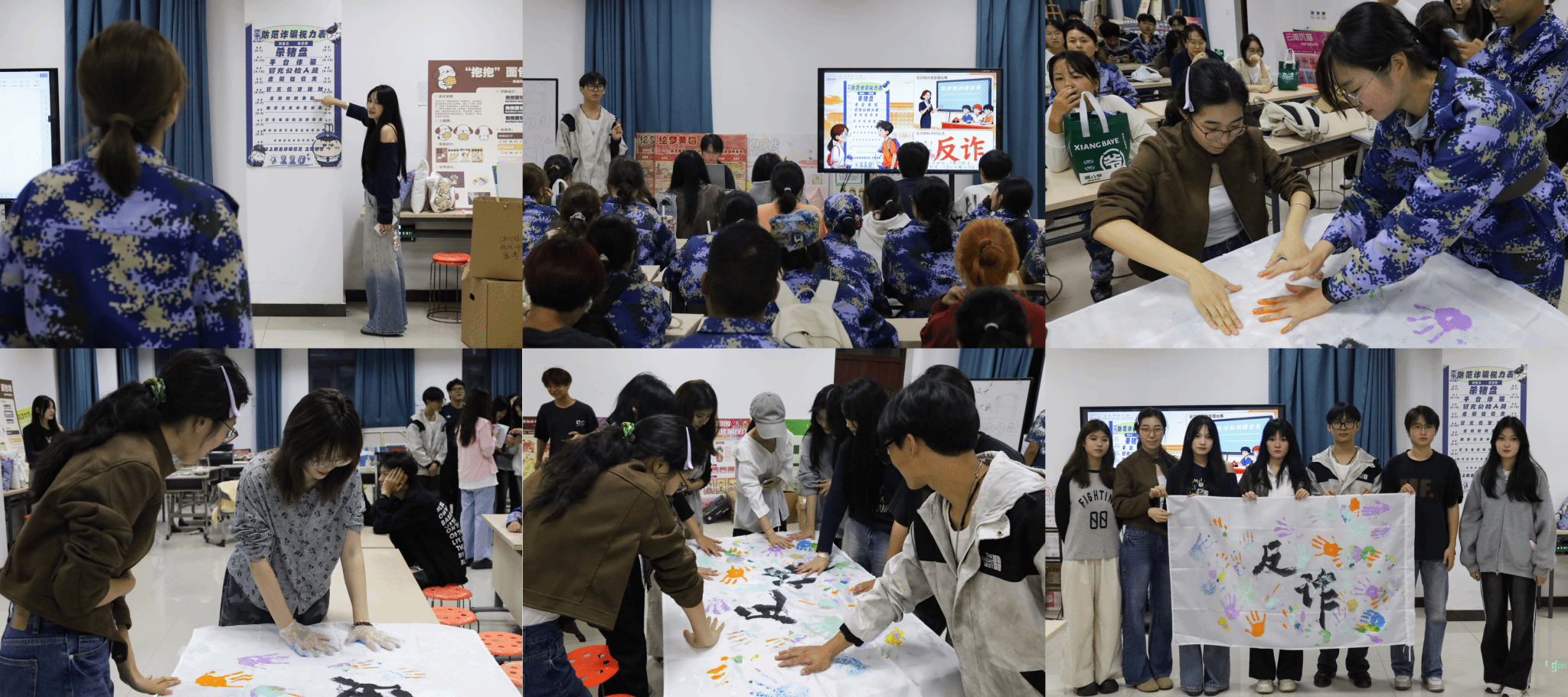 教室另一侧的桌子上,学生们陆续将手掌涂上不同颜色的颜料,在旗帜上按下庄重的手印。设计学类专业2025(1)班的沈乡红分享,作为美术生,对颜料有着天然的喜欢,用喜欢的颜色染满手掌,再按下承诺的手印,让她觉得格外有意义“:”“我感觉真正地参与了活动中,也真正学到了防电诈的技巧。”每一抹色彩都代表一份反诈承诺,每一次按压都是一次责任宣誓。这幅由集体创作的艺术作品,凝聚了校园反诈的共同意志。