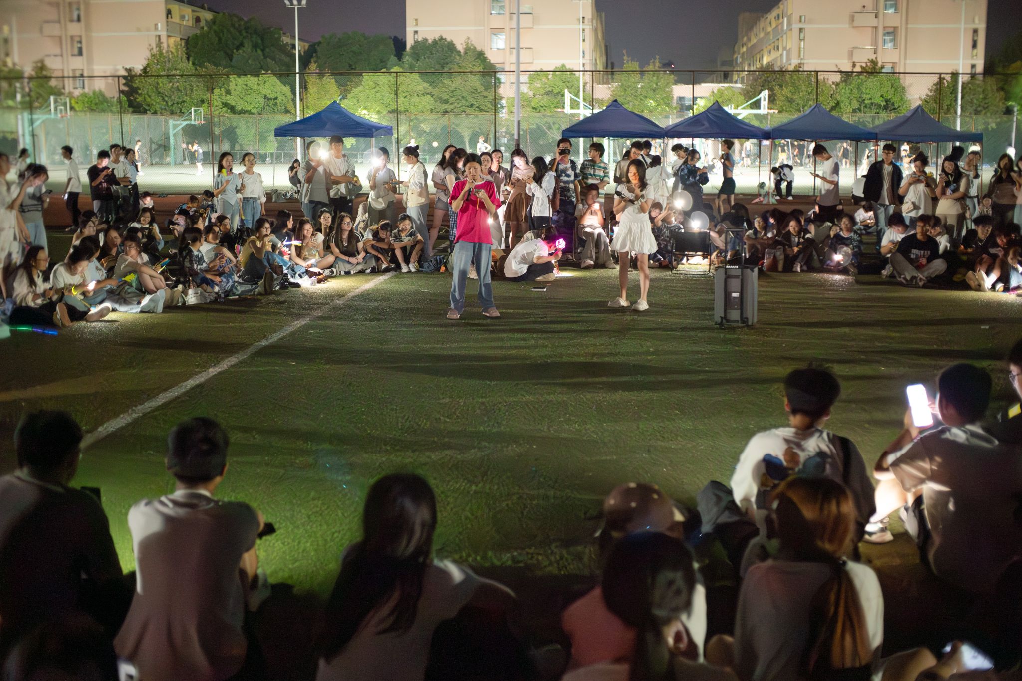 一首《探窗》唱出了古风戏腔的独特韵味,《你不在》将独属于少年人的情感悸动展现了出来,《蝴蝶》唱出了诗意的浪漫,《心许百年》把细腻真挚的情感表达得淋漓尽致……每一个节目如同一滴独特的“试剂”,在音乐节的“反应釜”中交融碰撞,绽放出别样的火花。虽无绚丽的灯光、精致的舞台,同学们以绿茵为天然席,以夜空为墨色幕,沾些桂香席地而坐,连指尖都染着草木的温软。