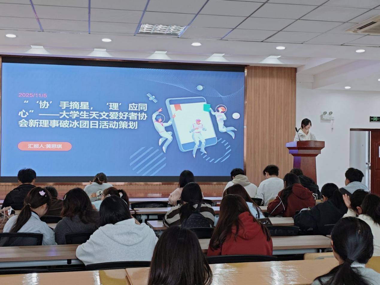 活动伊始,协会主题汇报拉开序幕,通过活动背景、流程设计等维度阐述协会工作规划,重点介绍了富有天文特色的互动环节内容。汇报围绕协会文化传承、职责分工及特色活动规划展开,强调通过协作任务帮助新理事快速建立信任与默契,为后续观测、科普等活动筑牢团队根基。