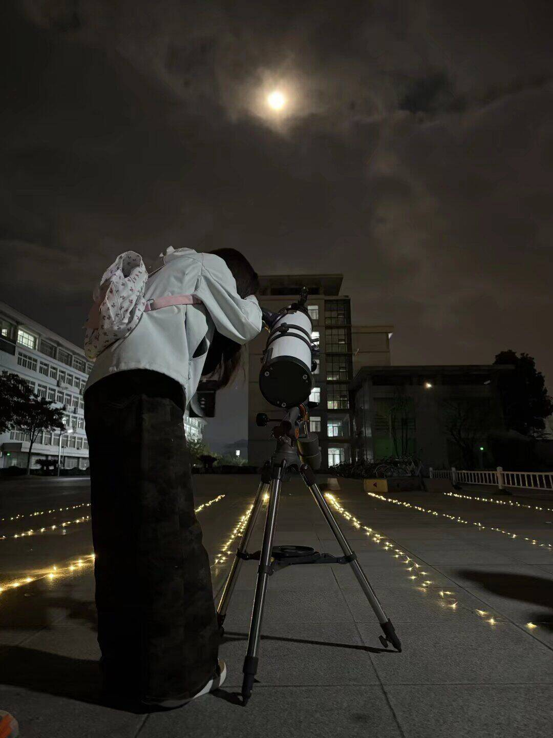 观测过程中,浓密云层一度遮蔽月面,给“超级月亮”的观测带来不小挑战。然而大家并未轻言放弃,而是密切观察天象变化,静待时机。当一阵清风悄然拨开云幕,一轮圆月骤然显现——其清晰的轮廓、明暗交错的月海与环形山细节令现场师生惊叹不已。同学们迅速调整设备,争相通过目镜记录这转瞬即逝的天文奇景,并用手机拍摄下珍贵影像。