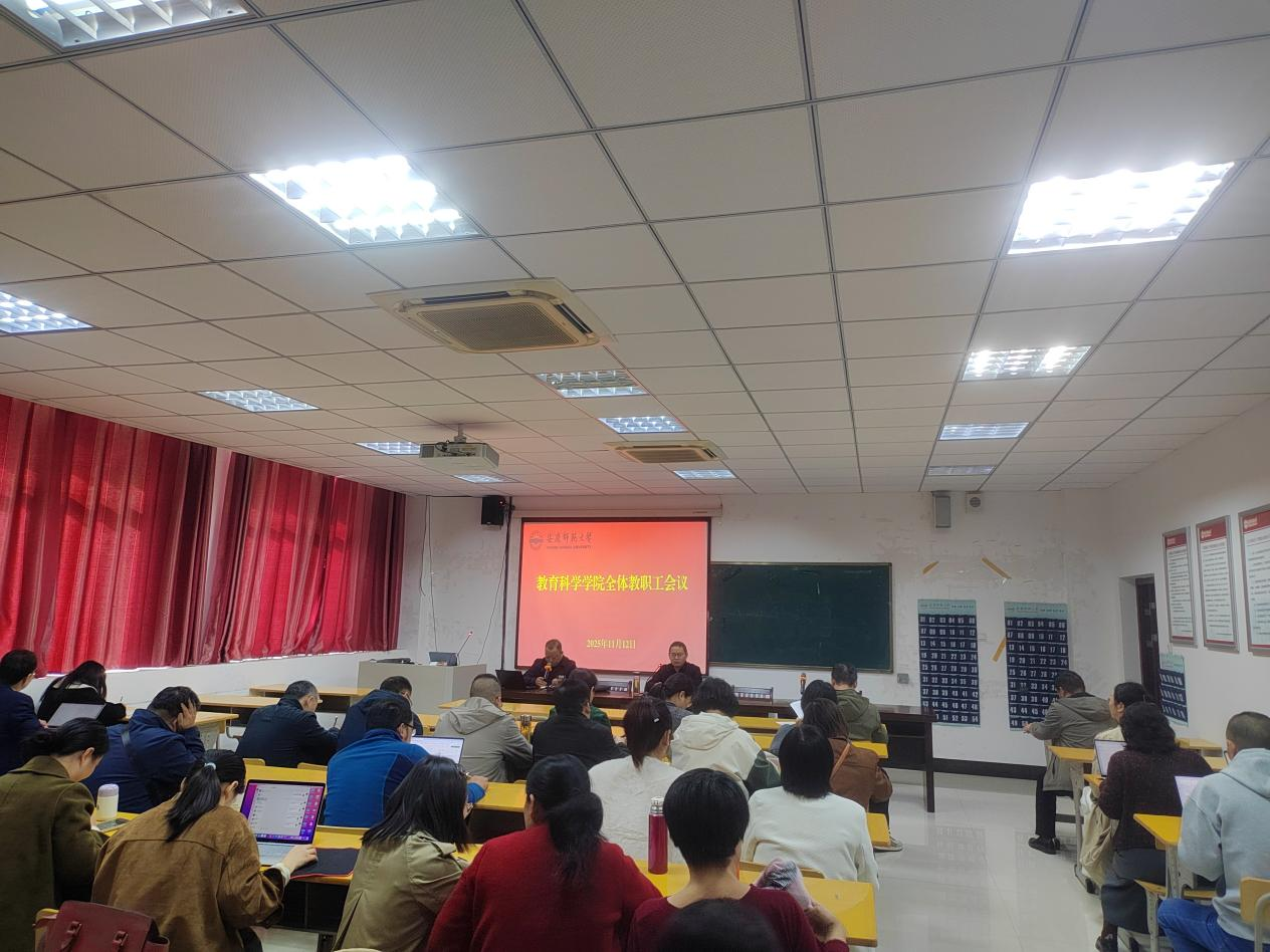 11月12日,教育科学学院在J305会议室召开全体教职工大会,学习宣传贯彻党的二十届四中全会精神,安排布置教育科学学院近期重点工作。会议由教育科学学院党委书记何孔蛟主持。
