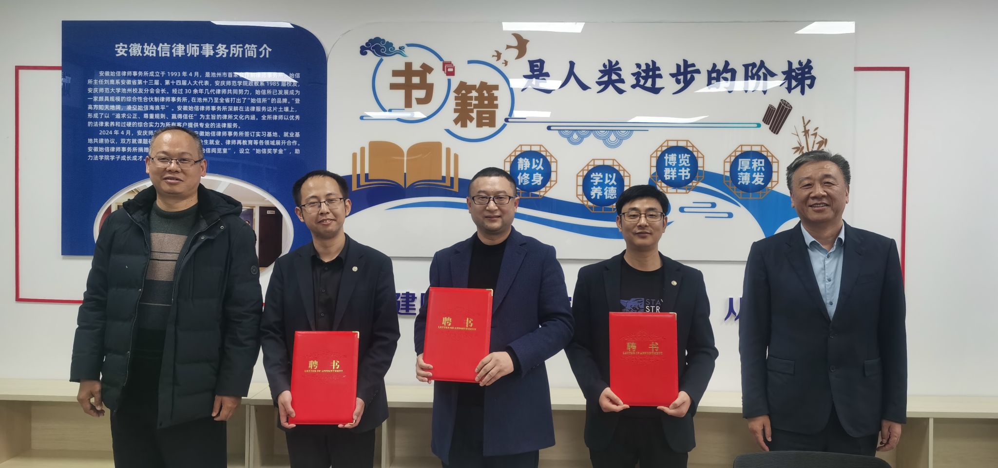 12月3日下午,法学院与安徽始信律师事务所协同育人平台——“始信阅览室”揭牌仪式在法学院四楼举行。学校1985届校友、安徽始信律师事务所主任刘鹰,律所高级合伙人、党支部书记唐开发,律所刑事业务部主任、2014届校友田源以及专职律师刘斌等一行四人返校参会,学校校友会秘书长王开友,法学院党委书记、校友分会会长钱敏,法学院副院长崔汪卫,党委副书记卫功兵,法学院副院长邱少晖,法学院教学秘书、校友分会秘书长李丹及师生代表共30余人参加。仪式由卫功兵主持。