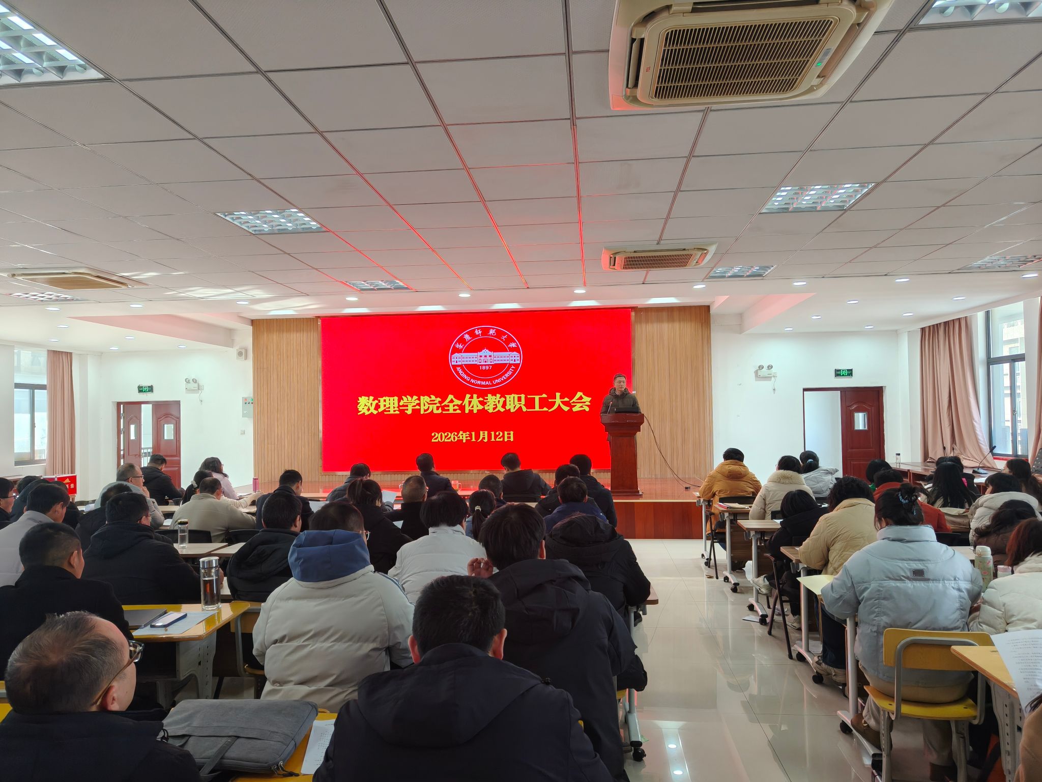 1月12日,数理学院在401报告厅召开全体教职工大会,总结回顾2025年度工作,部署期末及寒假重点任务。数理学院党委书记陆健,院长张海,副院长易明芳,党委副书记、纪委书记周刚,副院长陈文兵和全体教职工参加。会议由陆健主持。