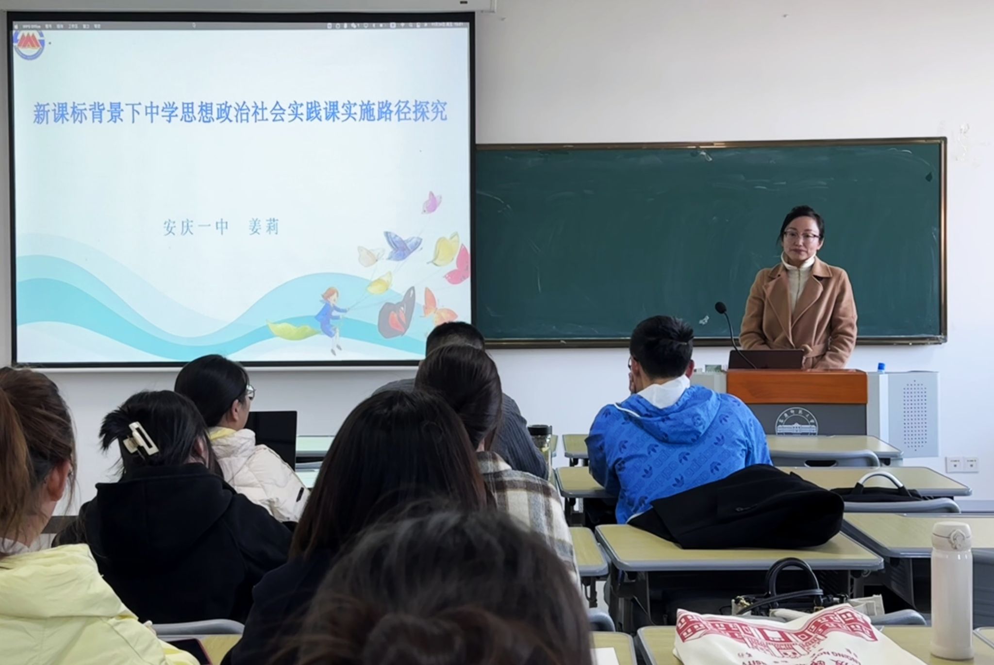 11月24日,安庆市中学政治学科带头人、安庆一中教师发展中心副主任姜莉应邀开展“新课标背景下中学思想政治社会实践课实施路径探究”的专题讲座,马克思主义学院2022级学科教学(思政)专业全体硕士研究生参加。